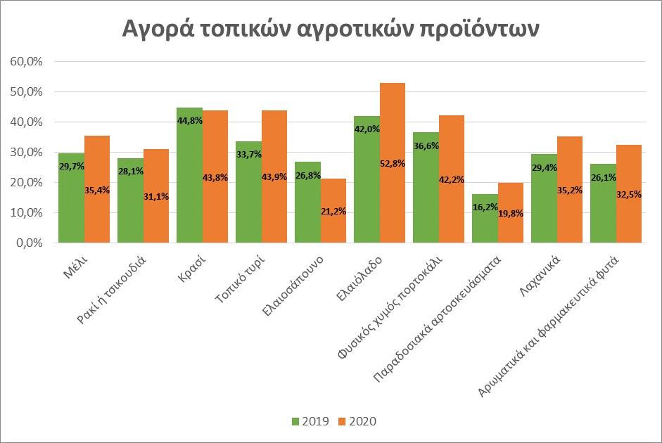 Υψηλά ποσοστά παρουσιάζουν φέτος, οι αγορές τοπικών αγροτικών προϊόντων από τους τουρίστες. Πάνω από τους μισούς αλλοδαπούς τουρίστες αγοράζουν ελαιόλαδο και ακολουθούν τα τοπικά τυριά, το κρασί και ο φρέσκος χυμός πορτοκαλιού. Ελαιόλαδο και τοπικά τυριά σημείωσαν τη μεγαλύτερη αύξηση σε σχέση με την προηγούμενη χρονιά.Το 35% των αλλοδαπών τουριστών αγόρασε μέλι και λαχανικά, ένας στους τρεις επισκέπτες προέβη σε αγορά αρωματικών/φαρμακευτικών φυτών, σχεδόν τρεις στους δέκα τουρίστες αγόρασαν τσικουδιά/ρακί και ένας στους πέντε επισκέπτες προέβη σε αγορά παραδοσιακών αρτοσκευασμάτων, σημειώνοντας σε όλα τα προϊόντα μια ενθαρρυντική αύξηση σε σχέση με την προηγούμενη περίοδο. Τέλος, περίπου ένας στους πέντε αλλοδαπούς τουρίστες αγόρασε ελαιοσάπουνο, ποσοστό όμως χαμηλότερο από το προηγούμενο έτος.