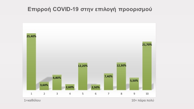 Σχετικά με την υγειονομική ασφάλεια του προορισμού, ένας στους τέσσερις αλλοδαπούς τουρίστες δήλωσε σε απόλυτο βαθμό ότι θα επισκεπτόταν την Κρήτη, ανεξαρτήτως κρουσμάτων COVID-19, ενώ περίπου ένας στους πέντε από τους αλλοδαπούς επισκέπτες επέλεξε αποκλειστικά την Κρήτη επειδή καταγράφει πολύ χαμηλό αριθμό κρουσμάτων. Συνολικά, η μέση βαθμολογία σε μια κλίμακα από το 1 έως το 10 αναφορικά με την πρόθεση επισκεψιμότητας στην Κρήτη είναι κάπου στη μέση, γεγονός που υποδεικνύει ότι οι αλλοδαποί επισκέπτες ναι μεν έχουν εκ των προτέρων αποφασίσει για τον τελικό τους προορισμό, αλλά λαμβάνουν και σοβαρά υπόψη τους και τον χαμηλό αριθμό των κρουσμάτων COVID-19 στην περιοχή.