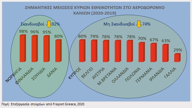 Η μείωση αυτή καταγράφεται από όλες ανεξαιρέτως τις εθνικότητες που επισκέπτονται τη Δυτική Κρήτη, με τη σημαντικότερη πτώση να παρουσιάζουν οι Σκανδιναβοί όπως είναι οι Νορβηγοί, Φινλανδοί, Σουηδοί και Δανοί με ποσοστό 92%, ενώ το ποσοστό μείωσης των μη Σκανδιναβών διαμορφώνεται στο επίσης υψηλό ποσοστό της τάξεως του 74%.