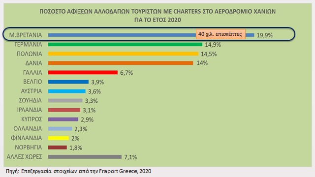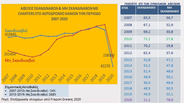 Σχετικά με τα ποσοστά αφίξεων των αλλοδαπών τουριστών στο αεροδρόμιο Χανίων για το έτος 2020, παρατηρείται ότι αλλάζει το μίγμα των εθνικοτήτων, αφού μόλις ένας στους πέντε αλλοδαπούς επισκέπτες είναι Σκανδιναβός, ενώ οι μισοί αλλοδαποί τουρίστες προέρχονται από μόλις τρία μη Σκανδιναβικά κράτη όπως είναι η Μ.Βρετανία, Πολωνία και Γερμανία, με τους Βρετανούς να συνεχίζουν να παραμένουν στην πρώτη θέση,όπως και την προηγούμενη περίοδο,με ποσοστό 20%, ενώ Γερμανοί και Πολωνοί καταλαμβάνουν τη δεύτερη και τρίτη θέση επί των συνολικών αφίξεων με ποσοστά 15% και 14,5%, αντίστοιχα. Αξιοσημείωτα είναι τα ποσοστά των Σκανδιναβών και συγκεκριμένα Νορβηγών και Φινλανδών που συγκεντρώνουν μόλις 2% έκαστος και Σουηδών με 3%, οπισθοχωρώντας προς τις τελευταίες θέσεις επί των συνολικών αφίξεων, όταν τα προηγούμενα έτη ήταν από τις κύριες εθνικότητες που επισκεπτόντουσαν τη Δυτική Κρήτη. Εξαίρεση αποτελούν οι Δανοί, οι οποίοι παραμένουν στην τέταρτη θέση επί των συνολικών αφίξεων με ποσοστό 14%.