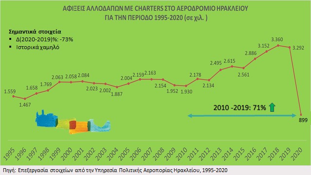 Αναφορικά με τις αφίξεις αλλοδαπών τουριστών στο αεροδρόμιο Ηρακλείου και με βάση τα στοιχεία της Υπηρεσίας Πολιτικής Αεροπορίας Ηρακλείου, για τoέτος 2020, σημειώνονται μόλις 900 χιλ. αφίξεις, καταγράφοντας μία εξίσου μεγάλη μείωση της τάξεως του 73% σε σχέση με το προηγούμενο έτος, αριθμός που αποτελεί επίσης ιστορικό χαμηλό τουλάχιστον κατά τα τελευταία 25 έτη.