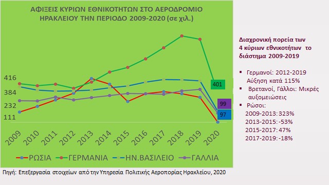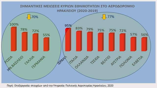 Η διαφορά όμως είναι ότι για το έτος 2020, οι Ρώσοι παρουσίασαν μηδαμινές αφίξεις, ενώ οι Γερμανοί, οι οποίοι σημείωσαν τη μικρότερη μείωση με 55%, αύξησαν το ποσοστό τους επί των συνολικών αφίξεων παραμένοντας στην πρώτη θέση με ποσοστό ίσο με 45% και ακολουθούν Γάλλοι και Βρετανοί με ποσοστά 11% και 10,8%, αντίστοιχα. Γάλλοι, οι οποίοι ξεπέρασαν σε αφίξεις τους Βρετανούς, καταλαμβάνοντας για πρώτη φορά τη δεύτερη θέση επί των συνολικών αφίξεων για τα τελευταία τουλάχιστον 11 έτη.