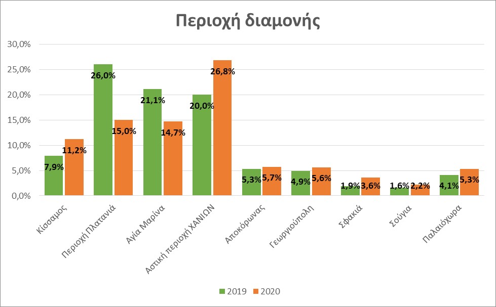 Σε σχέση με το προφίλ του αλλοδαπού τουρίστα, ο οποίος προτίμησε να κάνει διακοπές στην περιοχή της Δυτικής Κρήτης το 2020, δεν παρουσιάζονται διαφορές μεταξύ του αριθμού ανδρών και γυναικών, ενώ παρατηρείται μια αύξηση τουριστών νεαρής ηλικίας έως 34 ετών, αύξηση ιδιωτικών υπαλλήλων και φοιτητών, οι οποίοι προτιμάνε διακοπές με το/τη σύντροφο ή με φιλικές παρέες. Όσον αφορά την περιοχή διαμονής στο Νομό Χανίων, πρώτη επιλογή φέτος φαίνεται να είναι η Πόλη των Χανίων με πάνω από έναν στους τέσσερις να την επιλέγει, όταν πέρυσι μόλις ένας στους πέντε διέμεινε εκεί. Επίσης, σημαντική αύξηση παρουσιάζει η περιοχή της Κισσάμου, ενώ μικρές αυξήσεις παρατηρούνται και στις υπόλοιπες περιοχές της ενδοχώρας. Αντίθετα, μεγάλη πτώση παρουσιάζουν οι τουριστικές περιοχές της Αγίας Μαρίνας και του Πλατανιά με ποσοστό προτίμησης 15% για την κάθε περιοχή, όταν πέρυσι σχεδόν ένας στους τέσσερις είχε διαμείνει στην περιοχή του Πλατανιά και περίπου ένας στους πέντε στην περιοχή της Αγίας Μαρίνας. Η μείωση αυτή οφείλεται κυρίως στη μη λειτουργία ή λειτουργία μικρής χρονικής διάρκειας πολλών ξενοδοχειακών καταλυμάτων, λόγω της πανδημίας.