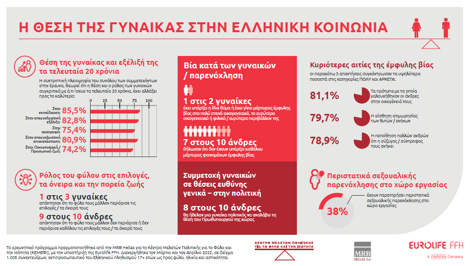 Το ερευνητικό πρόγραμμα «Η θέση της γυναίκας στην ελληνική κοινωνία», που αποτελεί ένα σημαντικό βήμα προς την κατανόηση ζητημάτων που αφορούν την ισότητα των φύλων, ανέδειξε τις πτυχές και τη σπουδαιότητα του θέματος. Διενεργήθηκε τον Μάρτιο και τον Απρίλιο 2022, σε δείγμα 1.005 συνεντεύξεων, αντιπροσωπευτικό του Ελληνικού πληθυσμού 17+ ετών ως προς φύλο, ηλικία και αστικότητα. Χωρίστηκε σε τρεις άξονες, με τον καθένα να συμβάλλει ουσιαστικά στη διεξαγωγή και αποτύπωση των συνολικών αποτελεσμάτων: