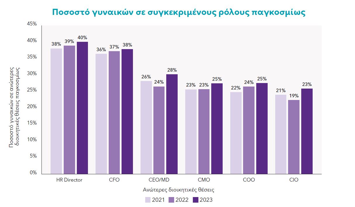 Το 38% των επιχειρήσεων παγκοσμίως έχουν γυναίκα σε θέση Chief Finance Officer (CFO), ποσοστό αυξημένο κατά 1 ποσοστιαία μονάδα σε σχέση με το προηγούμενο έτος. Σε σχέση με τα ευρήματα του 2022, ο αριθμός των γυναικών Chief Executive Officers (CEOs) αυξήθηκε κατά 4 ποσοστιαίες μονάδες, στο 28%, ενώ το ποσοστό γυναικών Chief Operating Officers (COOs) ενισχύθηκε στο 25% έναντι 24% το 2022. Παράλληλα, το ποσοστό γυναικών Chief Information Officer (CIO) σημείωσε άνοδο κατά 4 ποσοστιαίες μονάδες, στο 23%.