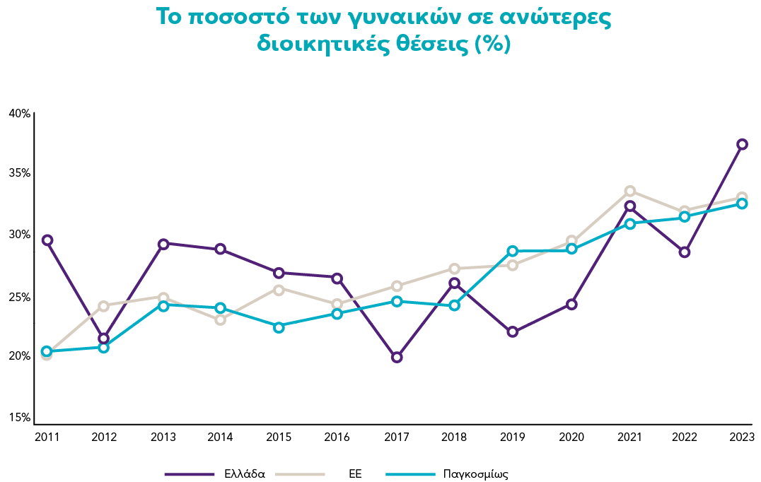 Στην Ελλάδα, το ποσοστό των γυναικών που βρίσκονται σε ανώτερες διοικητικές θέσεις κατέγραψε σημαντική άνοδο κατά 9 ποσοστιαίες μονάδες το 2023, στο 37% έναντι 28% το 2022, σκαρφαλώνοντας στο υψηλότερο επίπεδο που έχει σημειωθεί ποτέ, από τότε που ξεκίνησε η καταγραφή των σχετικών στοιχείων. Την ίδια στιγμή, το ποσοστό των επιχειρήσεων που δεν απασχολούν καμία γυναίκα σε ανώτερη διοικητική θέση κατέγραψε αξιοσημείωτη πτώση στο 11% έναντι 22% το προηγούμενο έτος, γεγονός που αποτελεί το δεύτερο χαμηλότερο ποσοστό από τότε που ξεκίνησε η έρευνα.