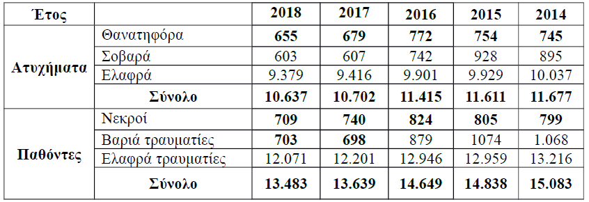 Στον πίνακα (1) καταγράφονται ορισμένα βασικά μεγέθη για τα τροχαία ατυχήματα και τους παθόντες την τελευταία πενταετία, προκειμένου να είναι ευχερής η σύγκριση από έτος σε έτος ενώ ο πίνακας (2) επικεντρώνεται στις μεταβολές για το έτος 2018 σε σχέση με το 2017.Στον πίνακα (3) παρατίθενται οι περιφερειακές ενότητες της χώρας ανάλογα με την επικινδυνότητα που παρουσιάζουν στα τροχαία ατυχήματα.