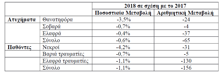 Από τα παραπάνω παρατηρούμε ότι για το έτος 2018 καταγράφηκε μείωση σε όλες τις κατηγορίες ατυχημάτων και παθόντων.
