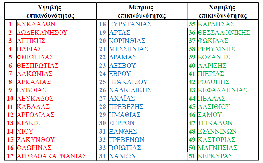 Οι περιφερειακές ενότητες, Αθήνα-Υπόλοιπο Αττικής, Αιτωλοακαρνανίας, Φθιώτιδας, Δωδεκανήσων, Εύβοιας, βρισκόταν και το προηγούμενο έτος στις περιφέρειες υψηλής επικινδυνότητας.