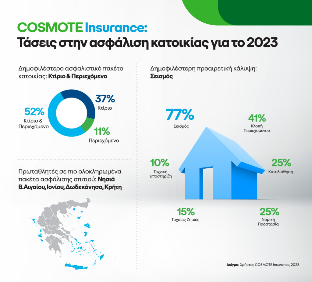 Η ασφάλεια «Κτιρίου και Περιεχομένου» αποτελεί το δημοφιλέστερο πακέτο στην ασφάλιση κατοικίας στην Ελλάδα, οι κάτοικοι των νησιών επιλέγουν περισσότερο πλήρη πακέτα ασφάλισης, ενώ η κάλυψη σεισμού είναι η δημοφιλέστερη προαιρετική κάλυψη, όπως προκύπτει από έρευνα του COSMOTEInsurance, που αναδεικνύει τις ανάγκες των καταναλωτών για πλήρη κάλυψη από φυσικές καταστροφές. Η προηγμένη ψηφιακή πλατφόρμα αγοράς ασφαλειών της COSMOTE μελέτησε τις επιλογές και τις προτιμήσεις των χρηστών της για το 2023, σχετικά με το πακέτο ασφάλειας που αγοράζουν για το σπίτι τους.