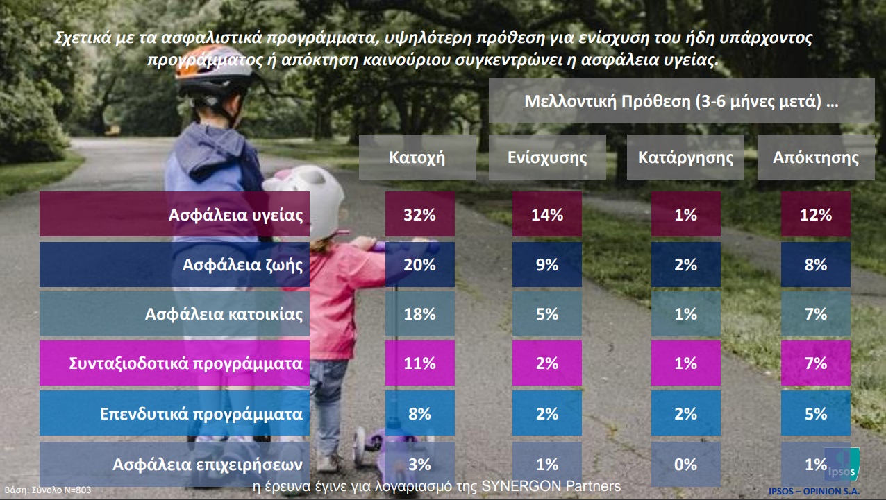 Όπως δείχνει η έρευνα η οποία έγινε μέσα στο Μάιο σε δείγμα 803 ερωτηθέντων το 20% έχει ασφάλιση ζωής και το 8% έχει ασφάλιση κατοικίας, το 11% συνταξιοδοτικά προγράμματα, το 8% επενδυτικά προγράμματα και το 3% ασφάλιση επιχειρήσεων.
