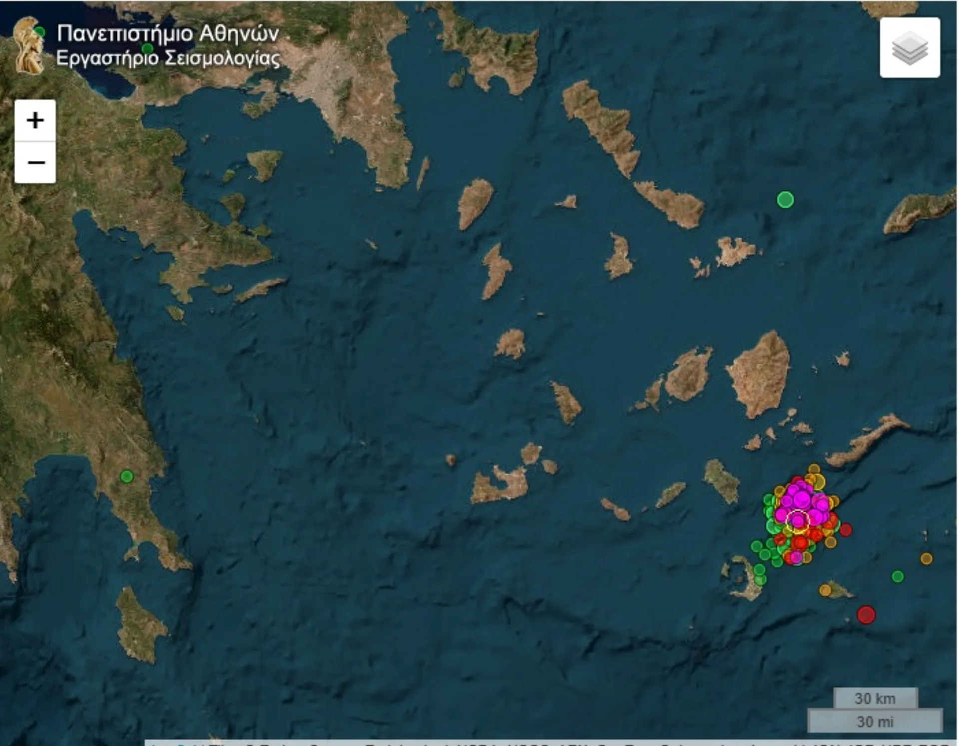 Το Εθνικό και Καποδιστριακό Πανεπιστήμιο Αθηνών, μέσω του Εργαστηρίου Σεισμολογίας του Τμήματος Γεωλογίας και Γεωπεριβάλλοντος, παρακολουθεί σε πραγματικό χρόνο την εξέλιξη της σεισμικής δραστηριότητας στο ηφαιστειακό σύμπλεγμα της Σαντορίνης, καθώς και στη ζώνη Σαντορίνης – Αμοργού, πλησίον της νησίδας Ανύδρου. Τον Ιούνιο του 2024 άρχισε να εμφανίζεται μικροσεισμική δραστηριότητα εντός της Καλδέρας της Σαντορίνης, η οποία εντάθηκε από τα μέσα Σεπτεμβρίου. Πρόκειται για την πρώτη φορά μετά την περίοδο 2011-2012 που εμφανίζεται σημαντική μικροσεισμική δραστηριότητα εντός της Καλδέρας. Στο πλαίσιο αυτής της δραστηριότητας, το Εργαστήριο Σεισμολογίας του ΕΚΠΑ έχει εγκαταστήσει μόνιμους σεισμολογικούς σταθμούς στη Σαντορίνη από το 2011. Αντιθέτως, η περιοχή του υποθαλάσσιου ηφαιστείου Κολούμπο, ~8 km ΒΑ της Σαντορίνης, εμφανίζεται διαχρονικά περισσότερο δραστήρια σεισμικά.