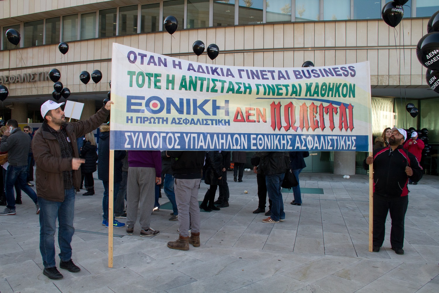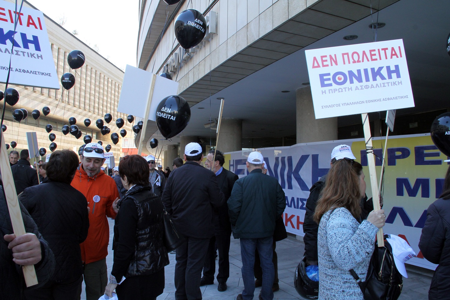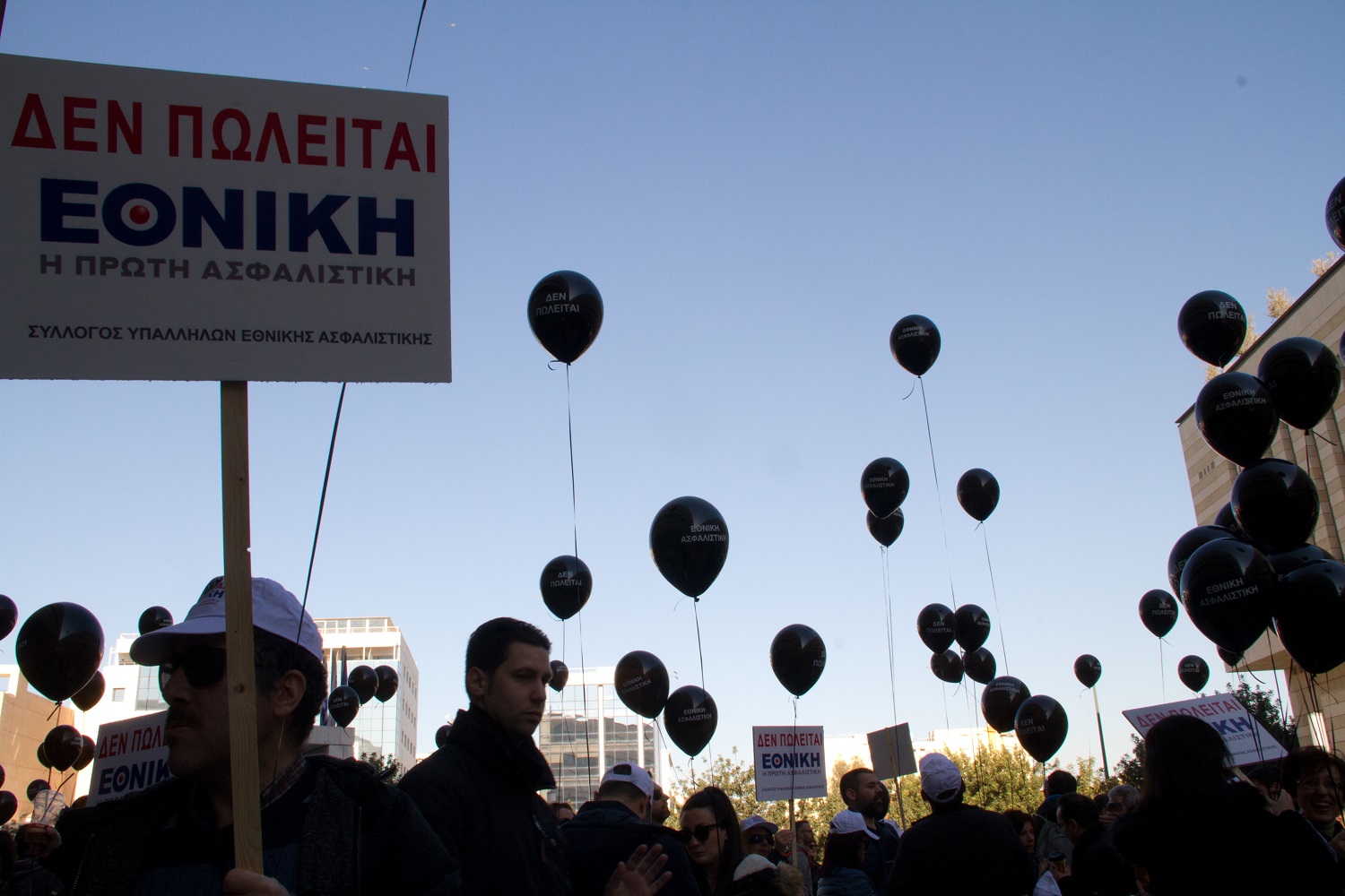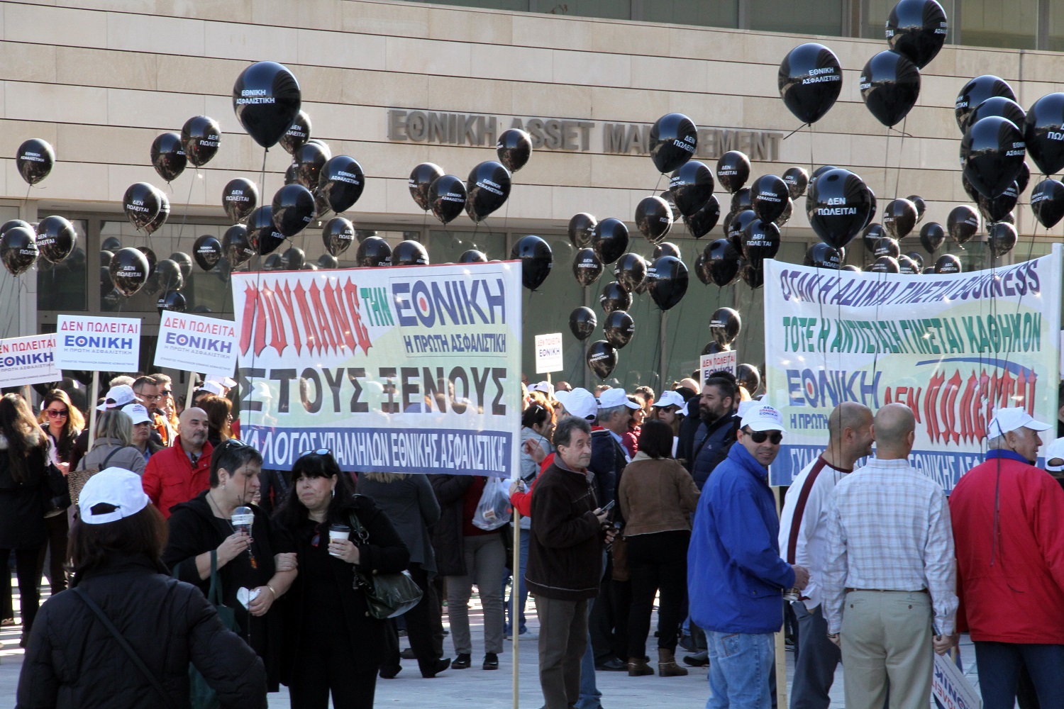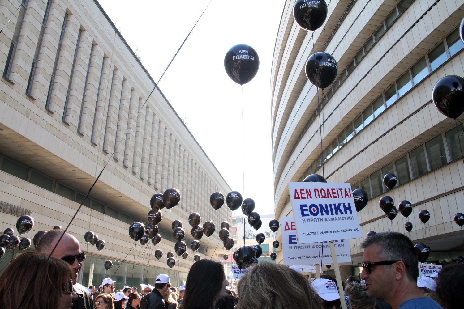 Περίπου 250 με 300 εργαζόμενοι συγκεντρώθηκαν το πρωί στην είσοδο της Εθνικής Ασφαλιστικής, κρατώντας συμβολικά μαύρα μπαλόνια για να στηρίξουν την παραμονή της Εθνικής Ασφαλιστικής στην τράπεζα και να να αποτρέψουν τις διαδικασίες που δρομολογούνται.