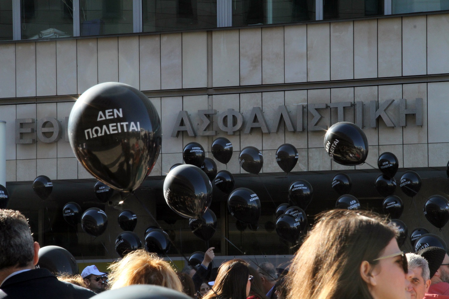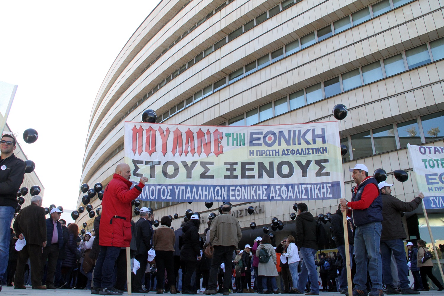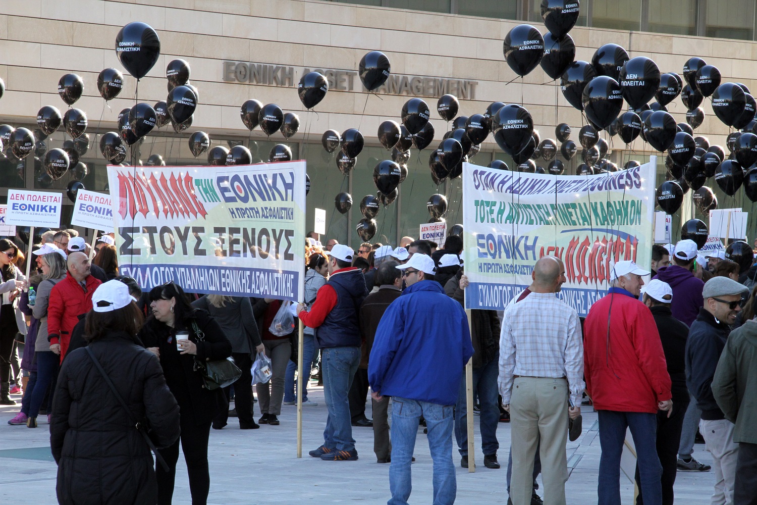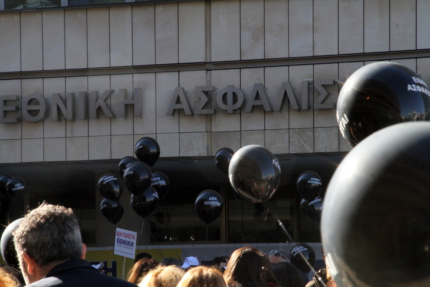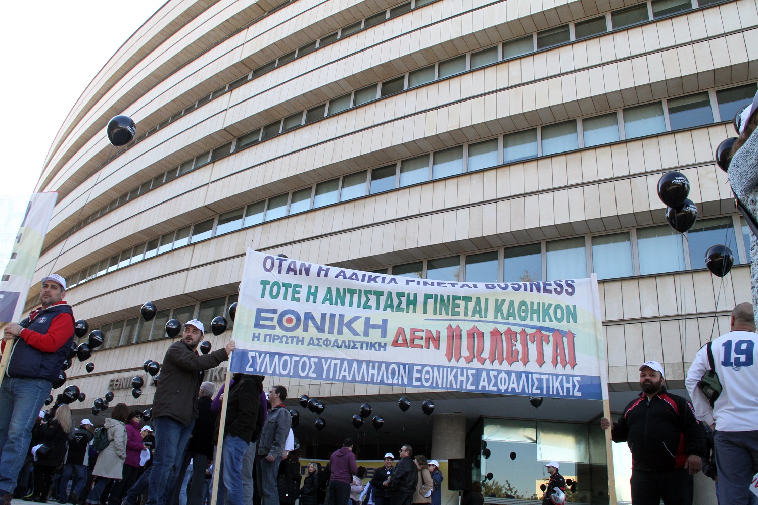 Περίπου 250 με 300 εργαζόμενοι συγκεντρώθηκαν το πρωί στην είσοδο της Εθνικής Ασφαλιστικής, κρατώντας συμβολικά μαύρα μπαλόνια για να στηρίξουν την παραμονή της Εθνικής Ασφαλιστικής στην τράπεζα και να να αποτρέψουν τις διαδικασίες που δρομολογούνται.