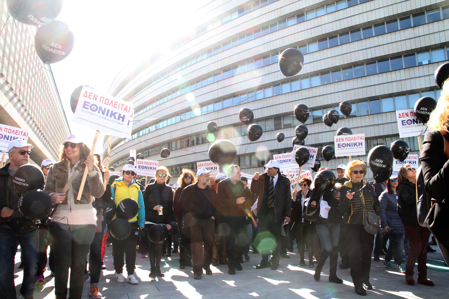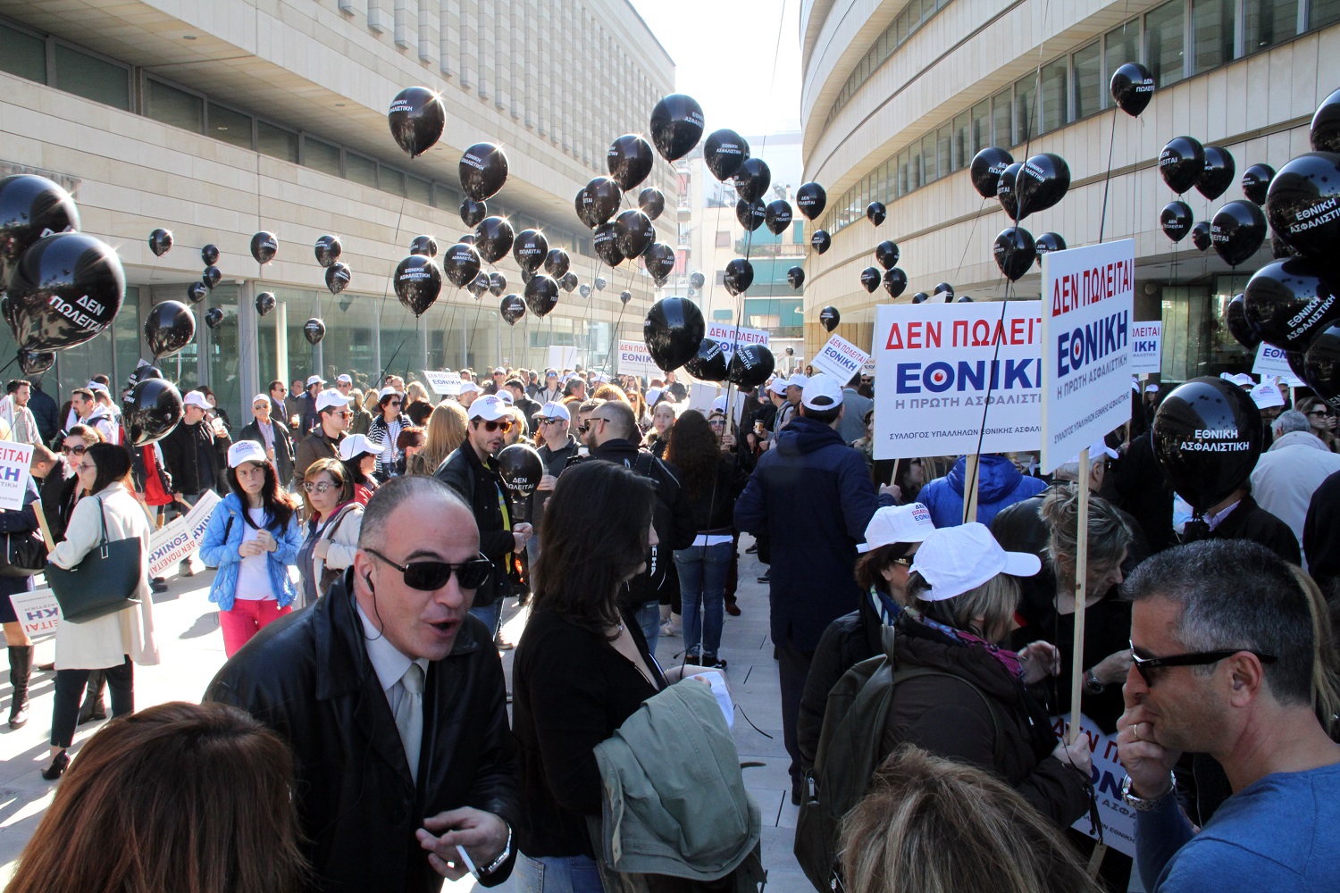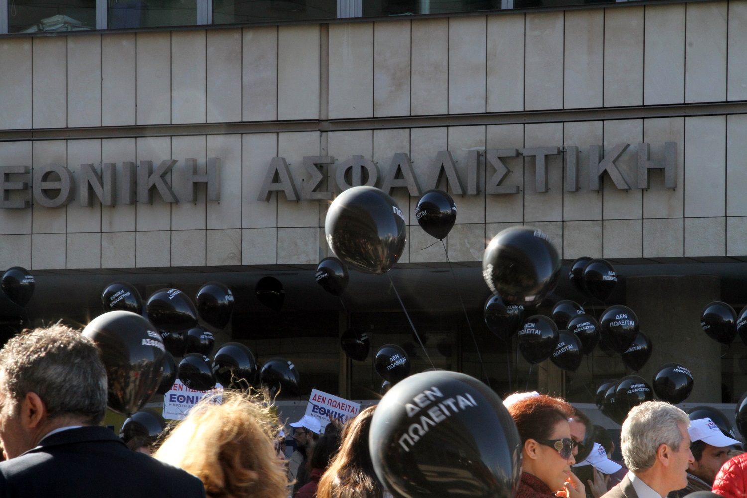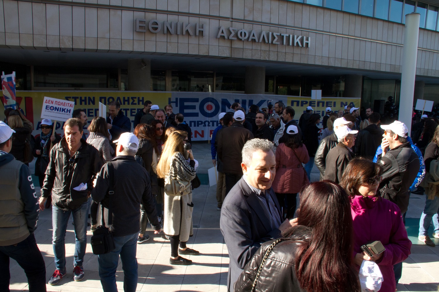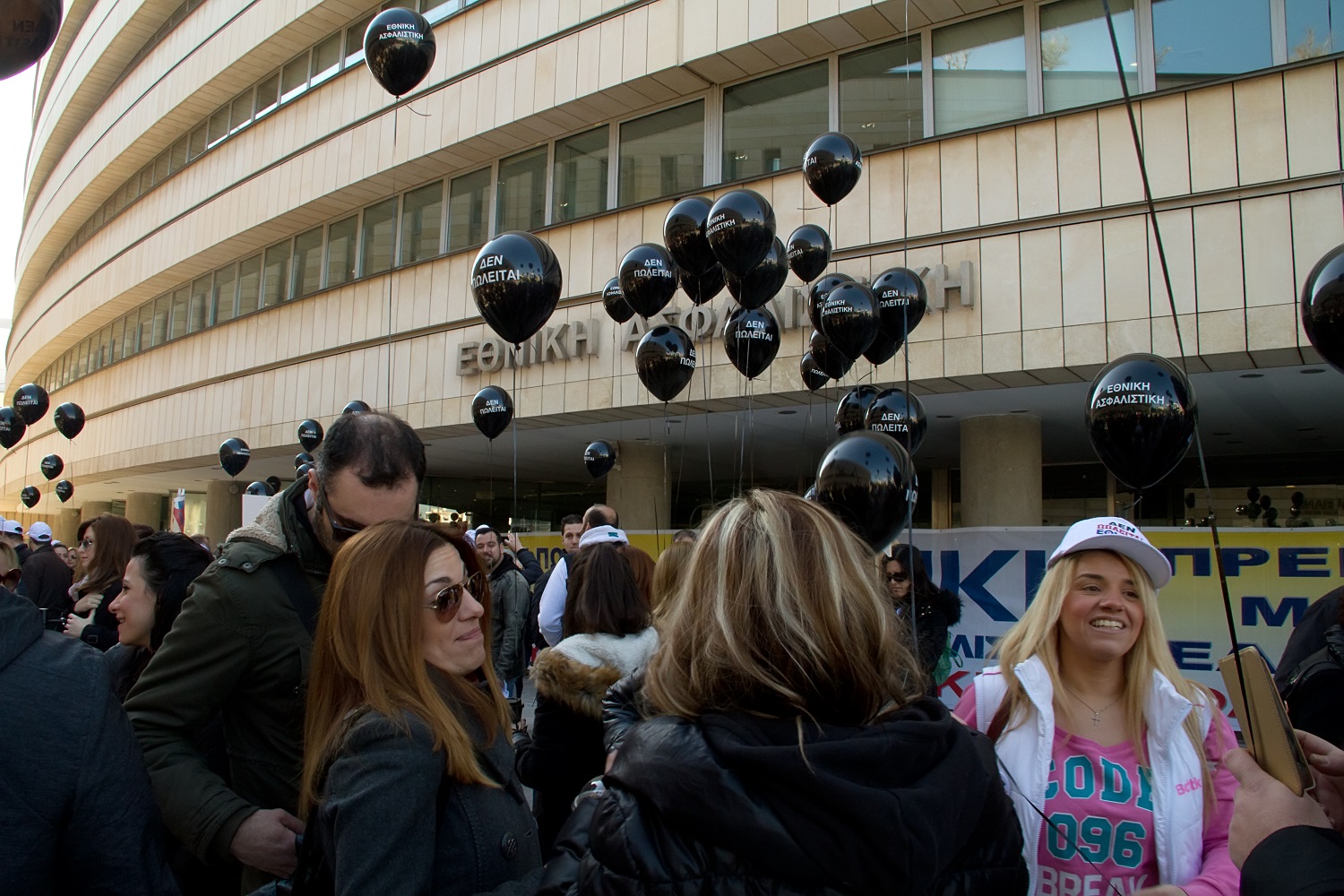 Περίπου 250 με 300 εργαζόμενοι συγκεντρώθηκαν το πρωί στην είσοδο της Εθνικής Ασφαλιστικής, κρατώντας συμβολικά μαύρα μπαλόνια για να στηρίξουν την παραμονή της Εθνικής Ασφαλιστικής στην τράπεζα και να να αποτρέψουν τις διαδικασίες που δρομολογούνται.