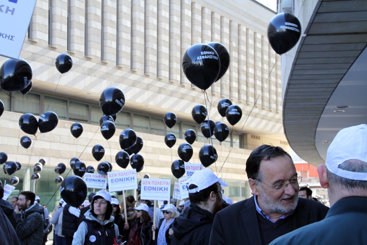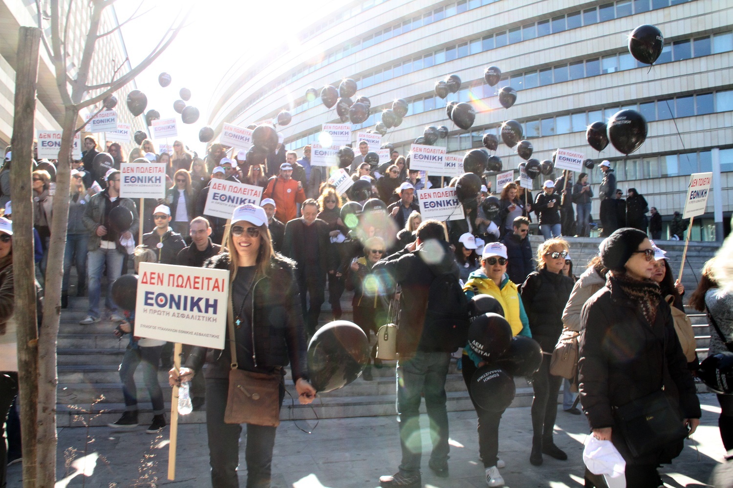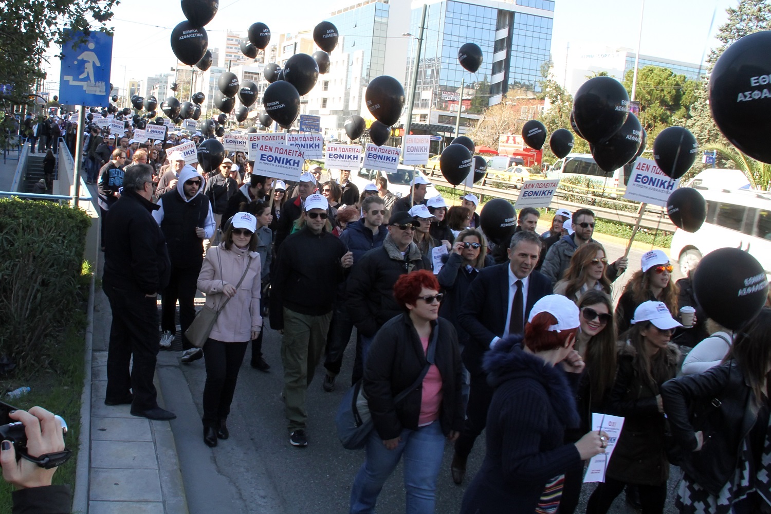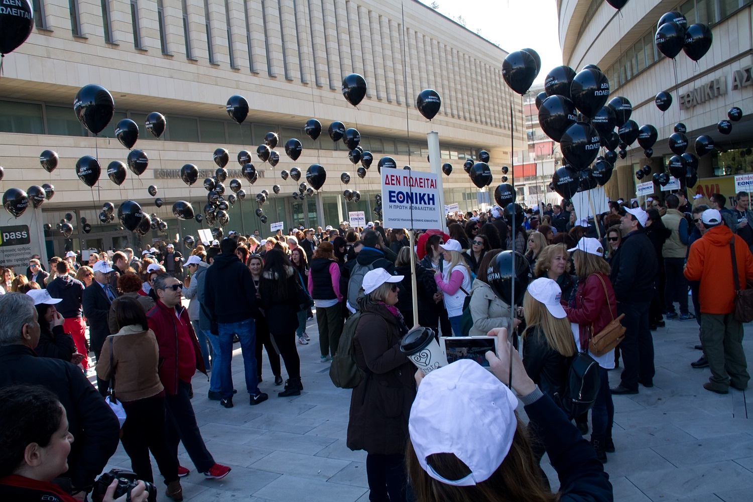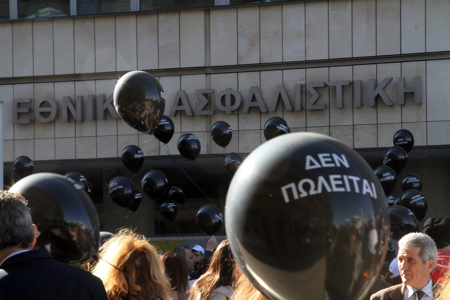 Περίπου 250 με 300 εργαζόμενοι συγκεντρώθηκαν το πρωί στην είσοδο της Εθνικής Ασφαλιστικής, κρατώντας συμβολικά μαύρα μπαλόνια για να στηρίξουν την παραμονή της Εθνικής Ασφαλιστικής στην τράπεζα και να να αποτρέψουν τις διαδικασίες που δρομολογούνται.