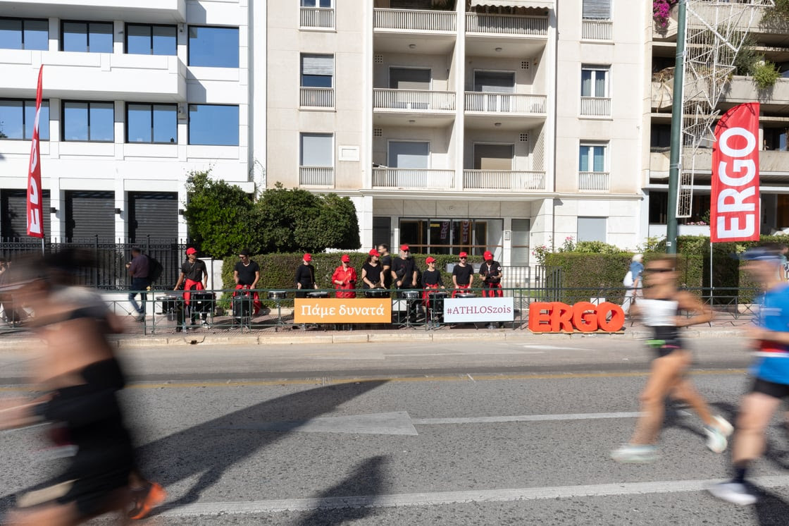 Κατά μήκος της διαδρομής όλων των αγώνων η ERGO υποστήριξε τους δρομείς με τις ομάδες των Επίσημων Εμψυχωτών της. Στην αρχή της διαδρομής επί της οδού Πανεπιστημίου, οι ήχοι από το δυνατό dj set μαζί και με τα εμψυχωτικά μηνύματα της ομάδας έδιναν τον απαραίτητο ρυθμό, ενώ επί της Λ. Βασ. Σοφίας ομάδα τυμπανιστών έδινε στους δρομείς περαιτέρω ώθηση για να ολοκληρώσουν την προσπάθειά τους, μέχρι τον τερματισμό.