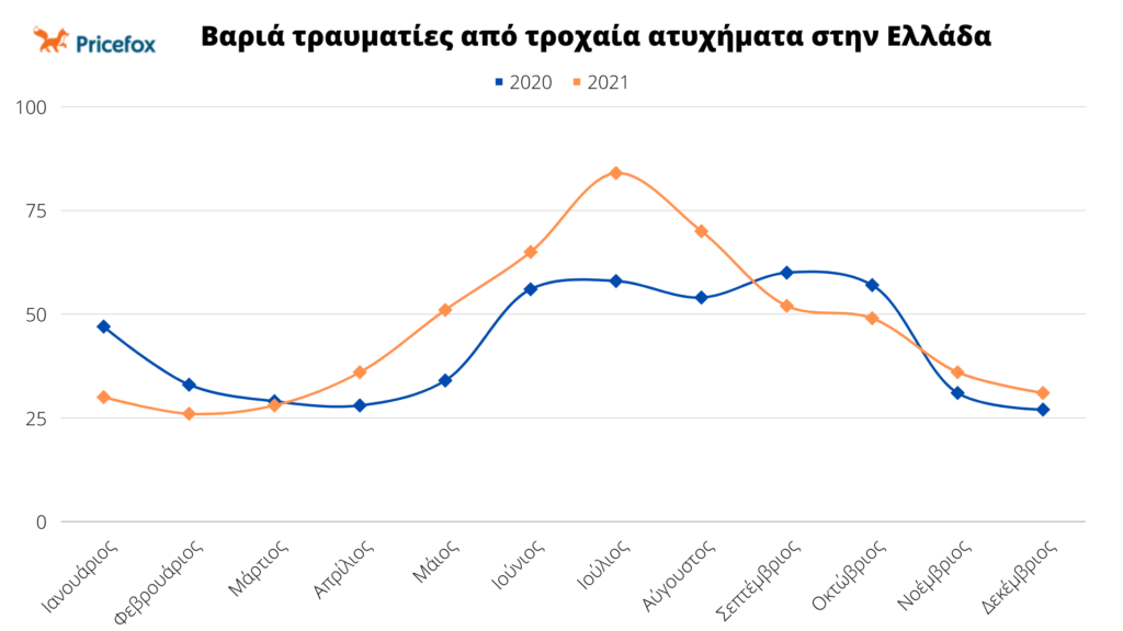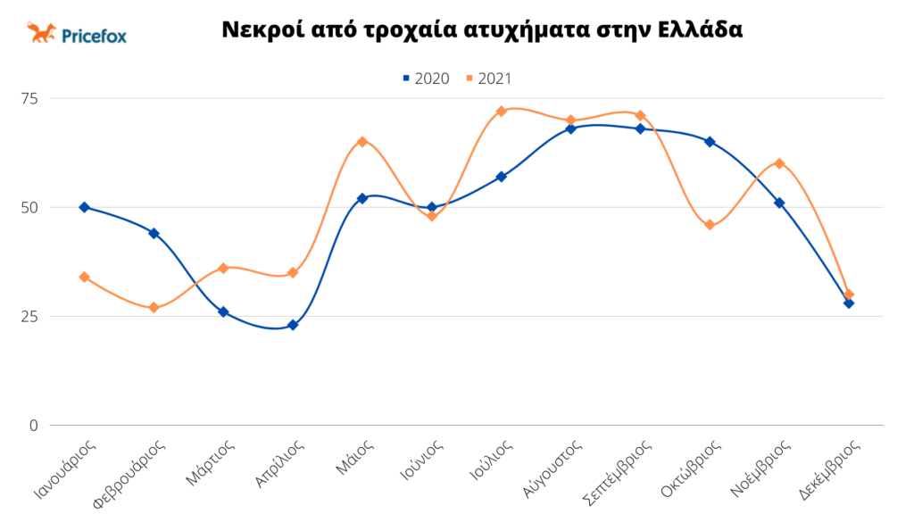 Συγκεκριμένα, σύμφωνα με τα στοιχεία του 2021 στα τροχαία υπήρξαν 594 νεκροί σε σχέση με 584 το 2020 κάτι που σημαίνει ότι χάνουν τη ζωή τους σχεδόν 2 άνθρωποι την ημέρα, ενώ βαριά τραυματισμένοι βρέθηκαν 558 άνθρωποι το 2021 σε σχέση με 514 το 2020. Τέλος η ραγδαία αύξηση υπήρξε και στους ελαφρά τραυματίες, οι οποίοι αυξήθηκαν κατά 1.273 άτομα, με το 2021 να αριθμεί περίπου 11600 ελαφρά τραυματίες σε σχέση με 10320 το 2020.