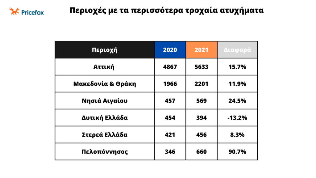Πέρα από τα τροχαία στην Αττική παρατηρούνται πολλές εμπλοκές σε τρακαρίσματα στα νησιά ειδικά τους καλοκαιρινούς μήνες. Έκπληξη ωστόσο αποτελεί η Πελοπόννησος που η διαφορά στα τροχαία ατυχήματα αγγίζει το 90.7%