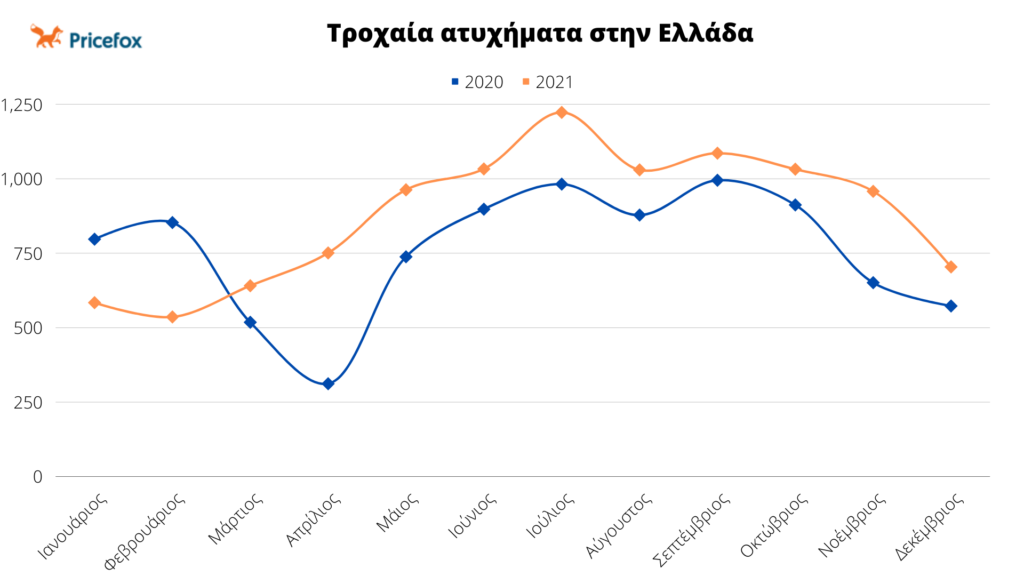 Μάστιγα συνεχίζουν να αποτελούν τα τροχαία ατυχήματα στην χώρα μας με τον αριθμό τους να αυξάνεται το 2021 κατά 16% σε σύγκριση με το 2020. Ρεκόρ κατέγραψαν οι καλοκαιρινοί μήνες με περισσότερα από 1000 τροχαία ανά μήνα. 584 οι νεκροί από τροχαία το 2021.