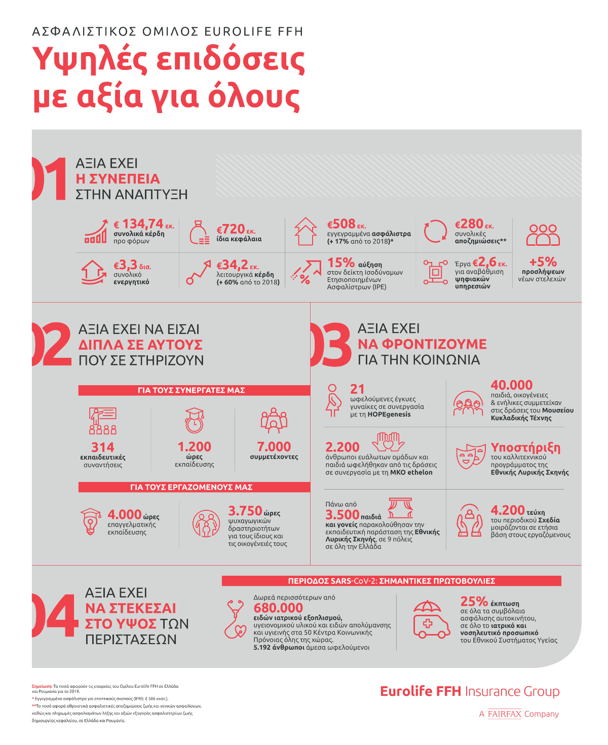 Ένα ιδιαίτερα παραγωγικό έτος, με θετική οικονομική αποτίμηση, ήταν το 2019 για τον Όμιλο Eurolife FFH, μέλος της Fairfax Financial Holdings Limited. Οι σημαντικές του επιδόσεις, σε συνδυασμό με μια σειρά από νέες πρωτοβουλίες και έργα, θέτουν τα θεμέλια για μια σθεναρή αντιμετώπιση των προκλήσεων της τρέχουσας χρονιάς. Για τον Όμιλο Eurolife FFH, αξία έχει να βρίσκεται στο πλευρό των ανθρώπων που εμπιστεύονται τα προϊόντα και τις υπηρεσίες του, πελάτες και συνεργάτες, με στόχο να τους ενδυναμώνει να καταφέρνουν περισσότερα καθημερινά.