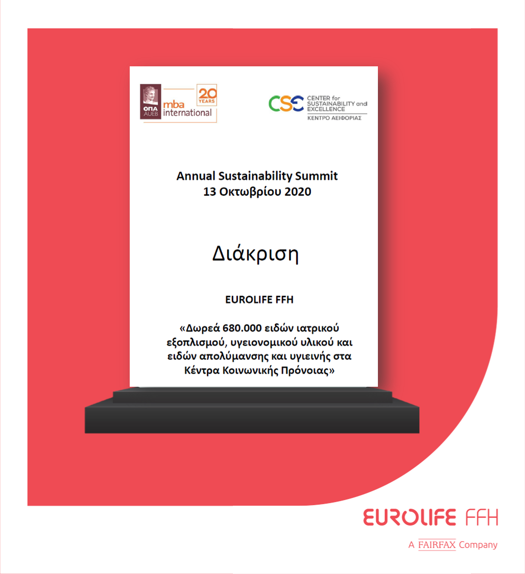 Eιδικό βραβείο για την καινοτομία και την κοινωνική προσφορά της έλαβε η Eurolife FFH στο πλαίσιο του 5ου Annual Sustainability Summit, το οποίο διοργανώθηκε την Τρίτη 13 Οκτωβρίου, από το Κέντρο Αειφορίας (CSE), σε συνεργασία με το MBA Internationalτου Οικονομικού Πανεπιστημίου Αθηνών.