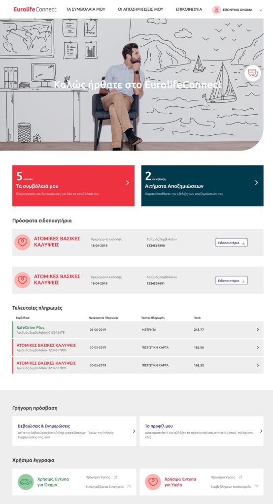Το EurolifeConnect είναι μια σύγχρονη και χρηστική υπηρεσία, η οποία διαμορφώθηκε και υλοποιήθηκε στο πλαίσιο του ψηφιακού εκσυγχρονισμού της εταιρείας. Για τον εύστοχο σχεδιασμό και την εξασφάλιση άριστης εμπειρίας χρήσης, δόθηκε πολλή προσοχή στις ανάγκες και προτιμήσεις όλων των προφίλ πελατών που συνθέτουν το χαρτοφυλάκιο της Eurolife. Ως προϊόν εκτεταμένης έρευνας και μελέτης, προσφέρει στους πελάτες μια ξεχωριστή εμπειρία ηλεκτρονικής εξυπηρέτησης. Το έξυπνα και εύχρηστα σχεδιασμένο interface του, σε συνδυασμό με τις πολλές δυνατότητες που παρέχει, αναβαθμίζουν την ποιότητα της online εξυπηρέτησης της Eurolife ERB, επιτρέποντας στον πελάτη να γνωρίζει ό,τι αφορά τα συμβόλαιά του από οποιαδήποτε συσκευή.