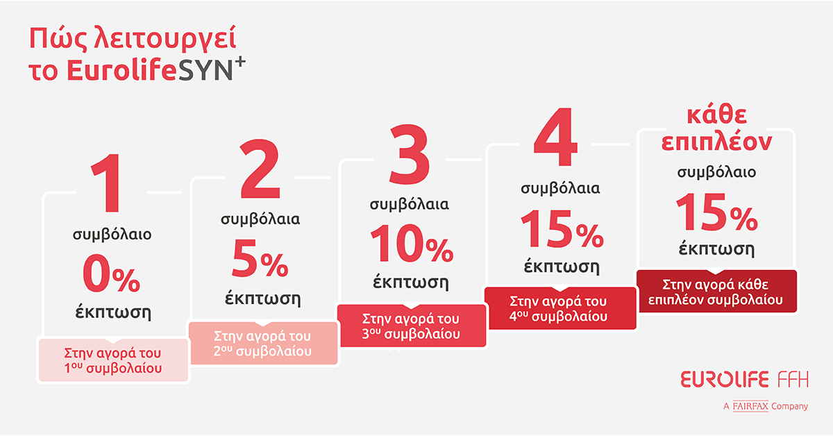 Το EurolifeSYN+ είναι ένα νέο, καινοτόμο πρόγραμμα, που προσφέρει στους ασφαλισμένους της η Eurolife FFH, μέσα από το οποίο αποκτούν σημαντικές εκπτώσεις ανάλογα με τον αριθμό των ασφαλιστηρίων συμβολαίων που έχουν στην κατοχή τους. Αυτό σημαίνει ότι όσο περισσότερες ασφαλιστικές ανάγκες καλύπτουν, τόσο μεγαλύτερη είναι η έκπτωση που δικαιούνται.
