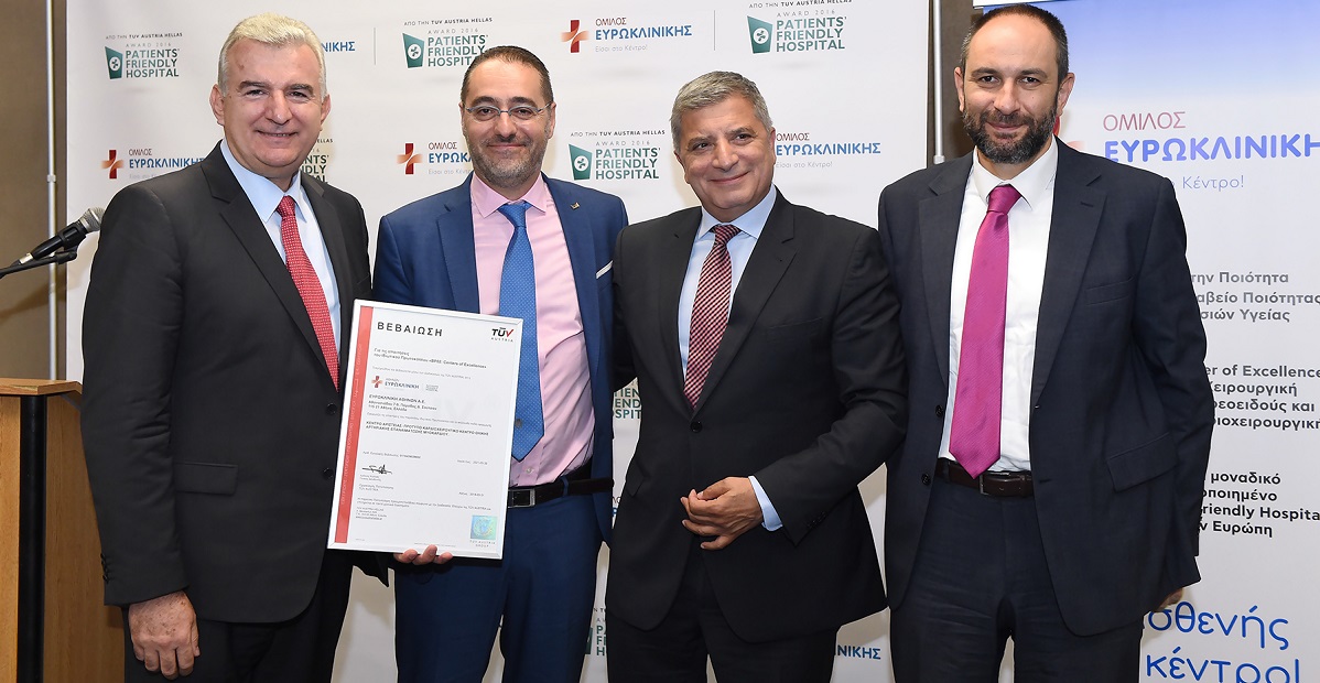 Το Πρότυπο Καρδιοχειρουργικό Κέντρο Ολικής Αρτηριακής Επαναιμάτωσης Μυοκαρδίου (Bypass) της Ευρωκλινικής Αθηνών, πιστοποιήθηκε ως «Center of Excellence» από τον ανεξάρτητο φορέα πιστοποίησης TÜV AUSTRIA HELLAS. Η απονομή πραγματοποιήθηκε την Παρασκευή 6 Ιουλίου στο κατάμεστο αμφιθέατρο του Ελληνικού Ινστιτούτου Παστέρ παρουσία πλήθους ιατρών και λοιπών επιστημόνων.