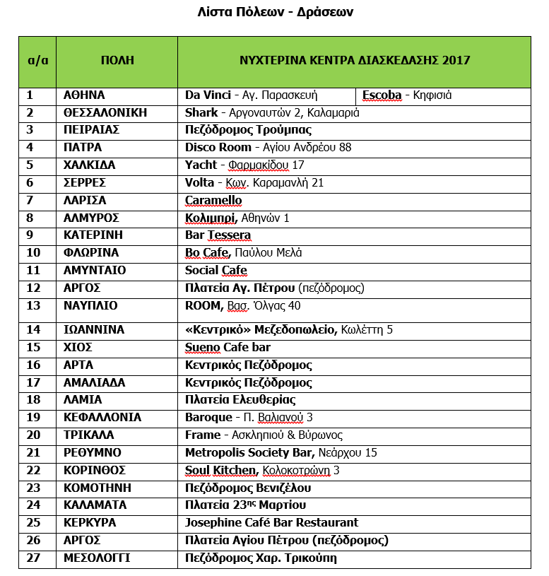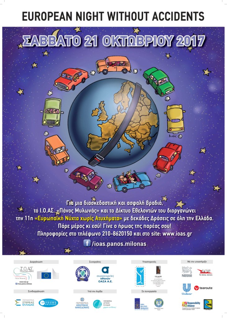 Με κεντρικό μήνυμα «το αλκοόλ και η οδήγηση δεν πάνε μαζί», το Ινστιτούτο Οδικής Ασφάλειας (Ι.Ο.ΑΣ.) «Πάνος Μυλωνάς» διοργανώνει το Σάββατο 21 Οκτωβρίου 2017 την 11η «Ευρωπαϊκή Νύχτα χωρίς Ατυχήματα» σε 27 πόλεις της Ελλάδας. Η ενέργεια πραγματοποιείται, όπως κάθε χρόνο, ταυτόχρονα με τη μεγάλη Πανευρωπαϊκή διοργάνωση, με στόχο την ενημέρωση και ευαισθητοποίηση κοινού και οδηγών για τους κινδύνους της οδήγησης υπό την επήρεια αλκοόλ.