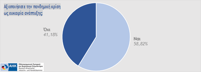 Ειδικότερα, από τους συμμετέχοντες, στο πρώτο σκέλος της έρευνας, το 58,82% δήλωσε ότι αξιοποίησε την κρίση του Covid-19 ως ευκαιρία έντασης της επιχειρηματικής δράσης και για το σκοπό αυτό: