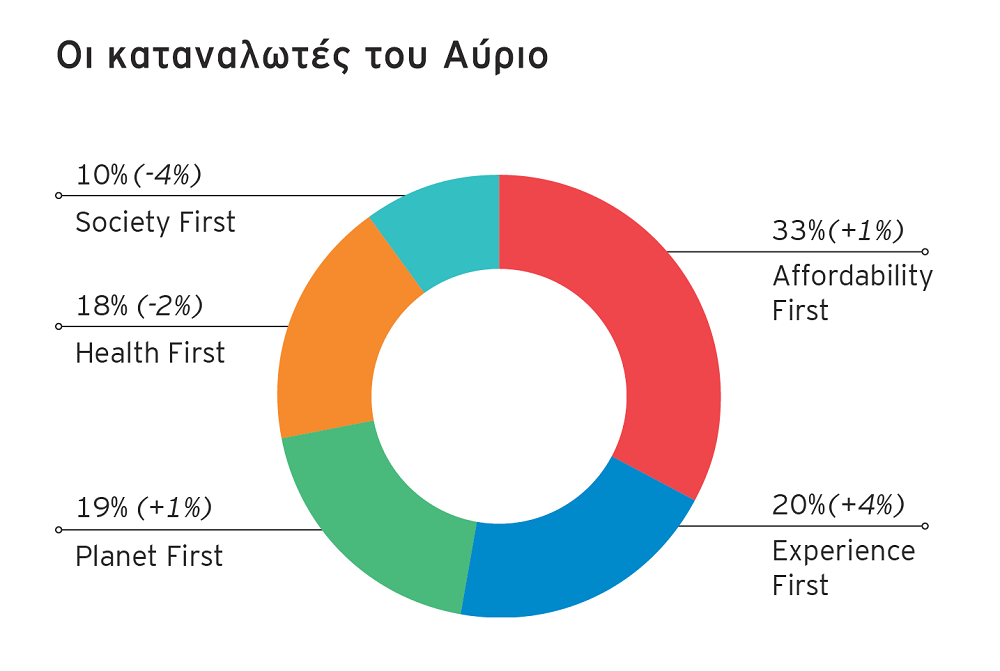 Στη πρώτη θέση, όπως και στην περσινή έρευνα Future Consumer Index Ελλάδα 2021, βρίσκεται η τυπολογία Affordability First (33%) που αποτελείται από καταναλωτές που ανησυχούν για τα οικονομικά τους και κάνουν συνετή οικονομική διαχείριση. Στη δεύτερη θέση, από την τέταρτη πέρσι, η ομάδα Experience First (20%), είναι αυτοί που αναζητούν εμπειρίες για να ζουν τη ζωή στο έπακρο, και αναζητούν και πειραματίζονται με το καινούριο. Οι ευαισθητοποιημένοι για τον πλανήτη και το περιβάλλον (Planet First – 19%), βρίσκονται στην τρίτη θέση, ξεπερνώντας την τυπολογία Health first (18%), όσων ανησυχούν για την προσωπική και την οικογενειακή υγεία. Τέλος, η ομάδα που προτάσσει το κοινωνικό σύνολο Society First (10%), βρίσκεται και φέτος στην τελευταία θέση.