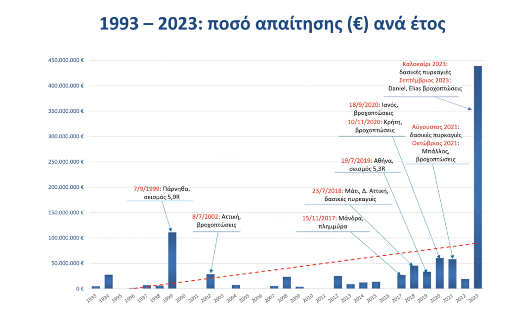 Αποζημιώσεις που αγγίζουν το 1 δις ευρώ έχουν καταβάλλει οι ασφαλιστικές εταιρείες στην Ελλάδα για 51 φυσικές καταστροφές με σημαντικές επιπτώσεις, ανάμεσα στις οποίες είναι η καταιγίδα Daniel και οι πλημμύρες που προκάλεσε στη Θεσσαλία, η φωτιά στο Μάτι, οι δασικές πυρκαγιές του 2021 και του 2023, η πλημμύρα στη Μάνδρα, η καταιγίδα Ιανός και ο μεγάλος σεισμός της Πάρνηθας το 1999.