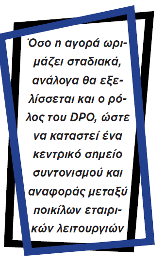 Κάνοντας μια μικρή αναφορά στο ρόλο του Data Protection Officer, θα πρέπει καταρχάς να αναφερθεί ότι ο ορισμός και η θέσπιση του συγκεκριμένου αυτού ρόλου είναι απαραίτητη για όλες τις εταιρείες ή οργανισμούς που πληρούν συγκεκριμένα κριτήρια επεξεργασίας ΔΠΧ. Καθώς η αγορά ωριμάζει σταδιακά, ανάλογα θα εξελίσσεται και ο ρόλος του Data Protection Officer, ώστε να καταστεί ένα κεντρικό σημείο συντονισμού και αναφοράς μεταξύ ποικίλων εταιρικών λειτουργιών (τεχνολογίας, συμμόρφωσης, ασφάλειας, νομικών υπηρεσιών, marketing κ.ά.), εταιρικής επικοινωνίας έναντι των αρχών και πρακτικής εμπειρίας εφαρμογής μηχανισμών προστασίας των ΔΠΧ κατά την επεξεργασία τους (συλλογή, μεταφορά, αποθήκευση κ.λπ.).