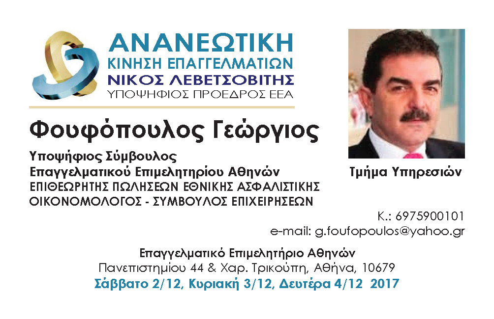 Ο Γιώργος Φουφόπουλος, κορυφαίος επιθεωρητής της Εθνικής Ασφαλιστικής για περισσότερο από μια δεκαετία κατεβαίνει υποψήφιος ως μέλος του σχηματισμού “Ανανεωτική Κίνηση Επαγγελματιών” με επικεφαλής τον νυν Α’ Αντιπρόεδρο του Επαγγελματικού Επιμελητηρίου Αθηνών Νίκο Λεβετσοβίτη.