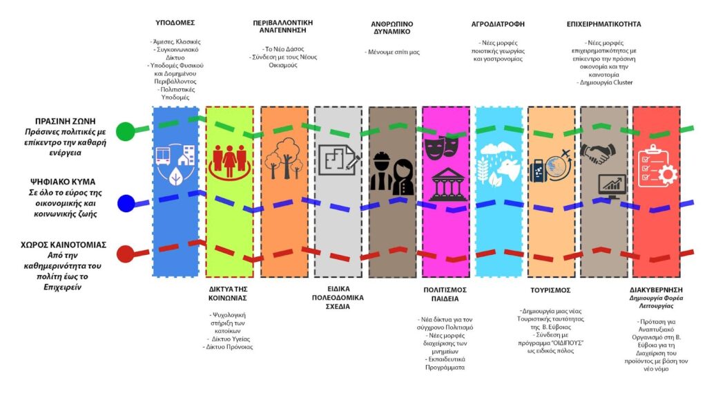 👉 Τρίτος σταθμός, ο σχεδιασμός και η παρακολούθηση προόδου των μεγάλων έργων ανασυγκρότησης της Βόρειας Εύβοιας και του Έβρου, που επλήγησαν πολλαπλά από μεγάλες πυρκαγιές. Η δεδομένη και αναγνωρισμένη οργανωτική εμπειρία, η καινοτομία και αποτελεσματικότητα του σωματείου, το έφερε με εντολή της Κυβέρνησης σε θέση πλοηγού για την υλοποίηση των πολυδιάστατων έργων στις πληγείσες περιοχές (πρόγραμμα “ΜΕΤΑ”). Είναι χαρακτηριστικά ενδεικτικό των συνεργειών ότι από τα Εταιρικά Μέλη του, το “Διάζωμα” συγκέντρωσε το ποσόν των 2,5 εκατ. ευρώ για τις 13 μελέτες που ξεκλείδωσαν τη χρηματοδότηση των έργων του προγράμματος στη Βόρεια Εύβοια, στους διακριτούς πυλώνες του σχεδίου – σε 7 άξονες, 71 ώριμα έργα (εικόνα). Αξίζει, ενδεικτικά για τη διαπίστωση του οργανωμένου σχεδιασμού και των συνεργειών, η διάθεση χρόνου για την ανάγνωση του Masterplan της Βόρειας Εύβοιας, στον σύνδεσμο: https://evoia-meta.b-cdn.net/meletes-telika/eviameta-masterplan.pdf?v=1