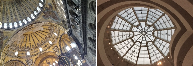 Η πρώτη είναι από το εσωτερικό της ΑγιαΣοφιάς (θυρανοίξια το 537) στην Κωνσταντινούπολη – η λήψη από κάτω προς τα πάνω. Αυτό προς το οποίο τείνω, με οδηγεί μαγνητικά. Η πνευματική πτητικότητα προς τον υπερουράνιο τόπο, που υποστηρίζεται από το δέος. Αποτέλεσμα: η ελαχιστοποίηση της βαρύτητας.