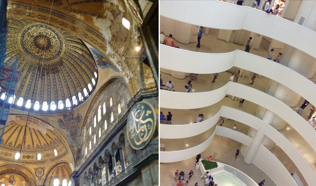 Η δεύτερη είναι από το Μουσείο Γκουγκενχάιμ (ίδρυση το 1939), του Solomon R. Guggenheim Foundation στη Νέα Υόρκη – η λήψη από πάνω προς τα κάτω. Αυτό στο οποίο έχω φθάσει ανεβαίνοντας, με πληροί. Η ελικοειδής από όροφο σε όροφο διαδρομή χωρίς σκάλα, γεμάτη εκθέματα – με εναλλαγές από εντύπωση σε εντύπωση, σε κάθε περίπτωση χωρίς το κενό της κάθετης μετάβασης με την κάψουλα του ανελκυστήρα αλλά περιέργως, η ανέλιξη βήμα το βήμα, με μικρή κλίση, χωρίς κόπωση. Η ελαχιστοποίηση της βαρύτητας, ομοίως.