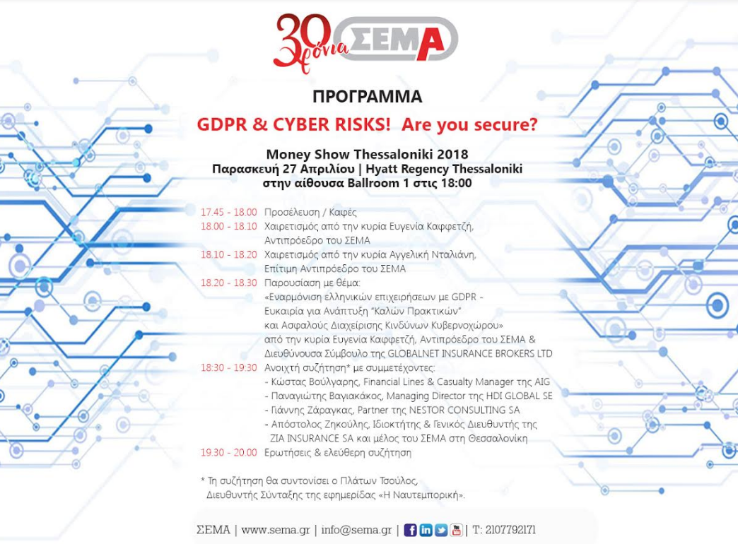 Ανοικτή συζήτηση με θέμα «GDPR & Cyber Risk! Are you secure?» διοργανώνει ο ΣΕΜΑ, στο πλαίσιο του Money Show Θεσσαλονίκης, την Παρασκευή 27 Απριλίου, στο Hyatt Regency Thessaloniki, στην αίθουσα Ballroom 1, στις 18:00. Η συζήτηση πραγματοποιείται σε συνεργασία με εξειδικευμένες εταιρείες στην εφαρμογή του GDPR και στο Cyber Risk Insurance και στο πλαίσιο αυτής θα συμμετάσχουν οι κ.κ. Κώστας Βούλγαρης Financial Lines & Casualty Manager της AIG, Παναγιώτης Βαγιακάκος Managing Director της HDI GLOBAL SE, Γιάννης Ζάραγκας Partner της NESTOR CONSULTING SA και Απόστολος Ζηκούλης Ιδιοκτήτης και Γενικός Διευθυντής της ZIA INSURANCE SA και μέλος του ΣΕΜΑ στη Θεσσαλονίκη.