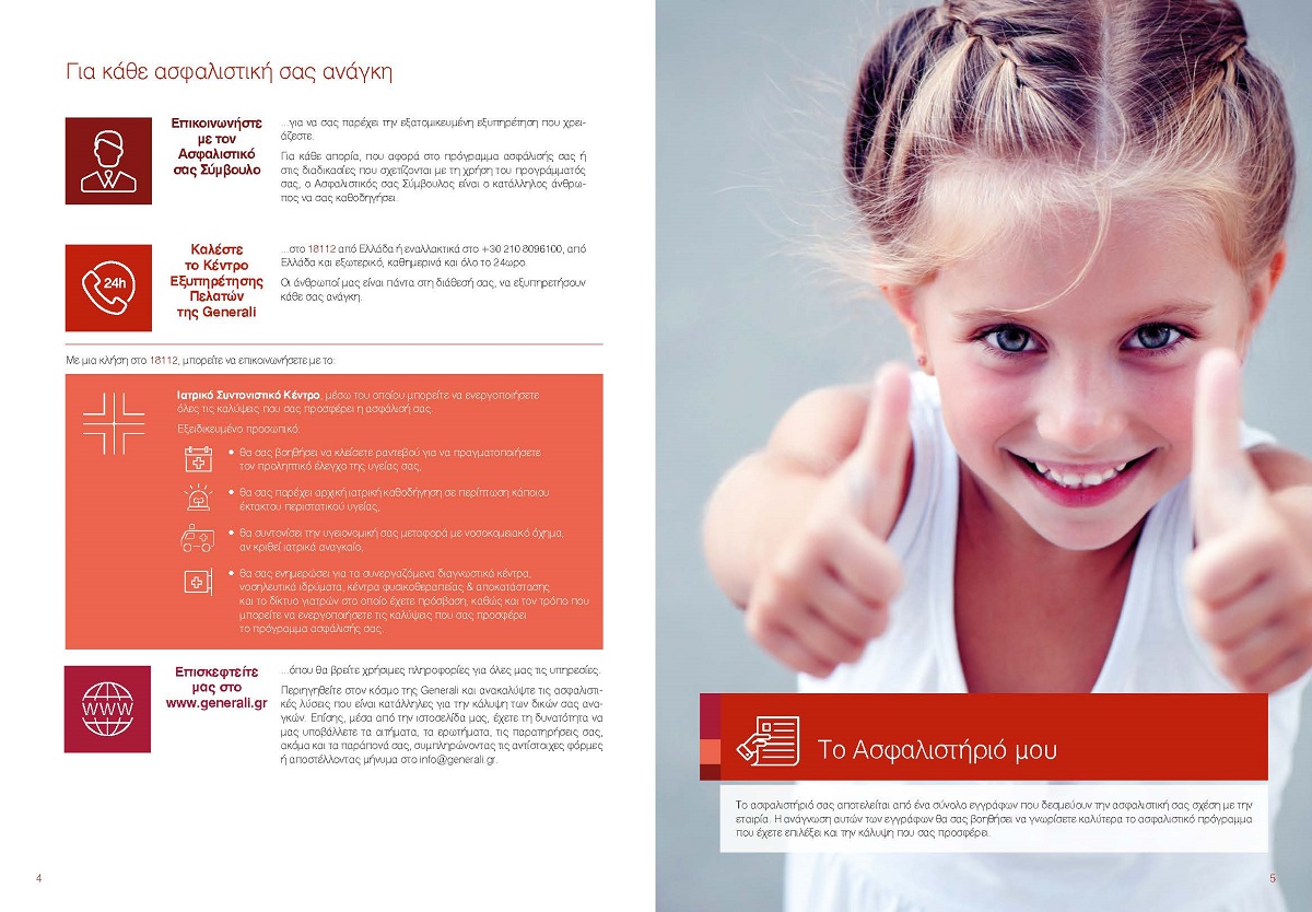 Καθώς η ασφάλιση αποτελεί μία υπηρεσία που ακολουθεί τον ασφαλισμένο σε κάθε του βήμα και αγκαλιάζει διαφορετικές πτυχές της ζωής του, η Generali αναζήτησε ένα επιπρόσθετο μέσο επικοινωνίας με τον πελάτη, που να ενισχύει τη συμβουλευτική διάσταση της ασφάλισης. Για να διασφαλίσει ότι ο ίδιος θα αξιοποιήσει στο μέγιστο την ασφαλιστική κάλυψη που του προφέρει το πρόγραμμά του, σχεδίασε χρηστικούς οδηγούς ασφάλισης. Μέσω των οδηγών, ο πελάτης πληροφορείται για τα βήματα και τις διαδικασίες που θα πρέπει να ακολουθήσει για να χρησιμοποιήσει την ασφάλισή του. Οι πληροφορίες έχουν οργανωθεί κατά τέτοιον τρόπο, ώστε ο ασφαλισμένος να μπορεί να περιηγηθεί εύκολα και γρήγορα, ανατρέχοντας στις ενότητες που τον αφορούν κατά περίπτωση. Ακόμη, μέσα από την κατηγοριοποίηση των παροχών σε διακριτές ενότητες, αναδεικνύονται με σαφή και εύληπτο τρόπο τα προνόμια του κάθε προγράμματος. Ο ασφαλισμένος τίθεται στο επίκεντρο, οι συχνές απορίες επιλύονται και ο οδηγός καθίσταται ένα σημείο αναφοράς, στο οποίο ο ίδιος μπορεί να ανατρέχει ξανά και ξανά, γνωρίζοντας σε βάθος την αξία της ασφάλισής του. Η φιλοσοφία σχεδίασης είναι αυτή που διαφοροποιεί το νέο επικοινωνιακό υλικό. Το περιεχόμενο αποτελεί προϊόν διατμηματικής συνεργασίας και ανάλυσης των συχνότερων σημείων, για τα οποία τόσο οι ασφαλισμένοι όσο και οι διαμεσολαβητές ζητούν συχνά ανατροφοδότηση. Με τη χρήση απλής γλώσσας, παραδειγμάτων αλλά και ειδικών σχεδιαγραμμάτων, η πληροφορία οργανώνεται κατά τρόπο πρακτικό και εύληπτο, ώστε να απαντά στις ανάγκες του χρήστη. Οι οδηγοί ενισχύουν έτσι το συμβουλευτικό ρόλο του ασφαλιστικού διαμεσολαβητή, ο οποίος διαθέτει, πλέον, ένα ακόμη εργαλείο για να προσφέρει στον ασφαλισμένο και πελάτη του, πρόσβαση στις πληροφορίες που τον αφορούν, με τρόπο εύκολο και σαφή.