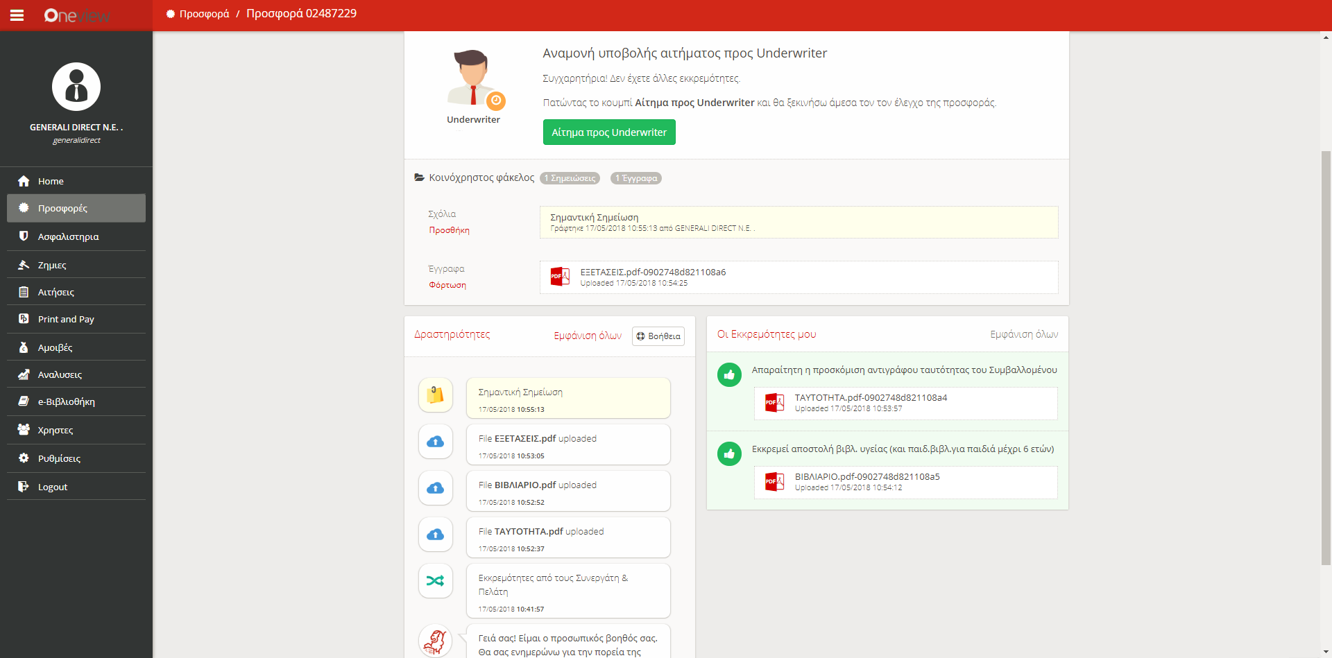 Στην πλήρη ψηφιοποίηση της εμπειρίας των καταναλωτών, από τη στιγμή που θα λάβουν μια προσφορά ασφάλισης μέχρι τη διαχείριση των αιτημάτων τους προς την εταιρεία, προχωρά η Generali. Χάρη στη δημιουργία ενός κοινού περιβάλλοντος εργασίας, στο κεντρικό portal OneView της Generali, τόσο ο συνεργάτης, ο οποίος θα καλείται να διαχειριστεί το αίτημα του πελάτη, όσο και ο underwriter που πραγματοποιεί την εκτίμηση του κινδύνου, θα μπορούν να βλέπουν και να αξιολογούν τα ίδια δεδομένα.