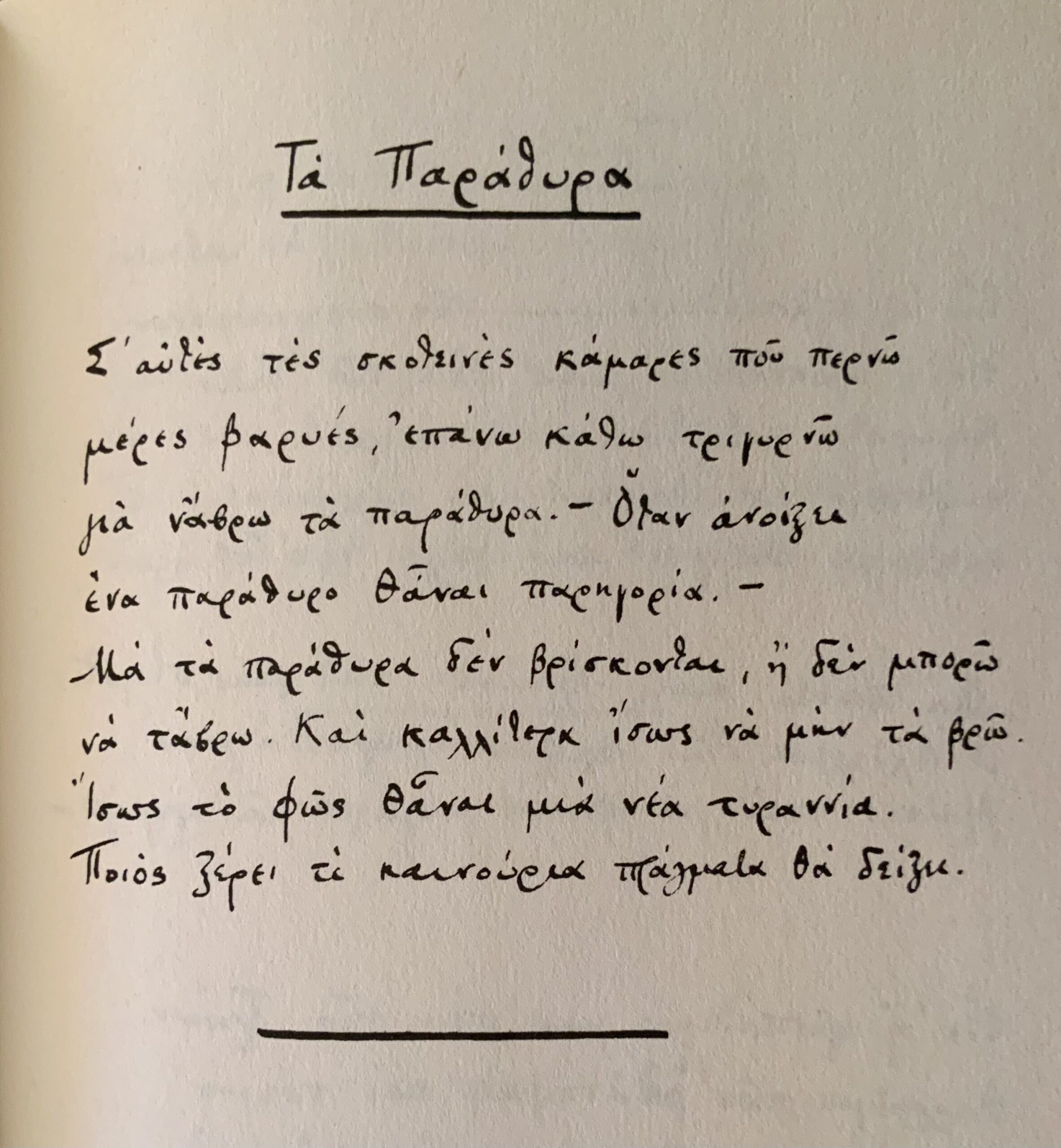 Ο Λόγος γίνεται το καταφύγιο κάθε απεγνωσμένου αιτήματος για να χαράξει κάποια ελπίδα “Σ’ αυτές τες σκοτεινές κάμαρες” – ένα φως από κάποια “Παράθυρα”, που αναζητούνται σε ερεβώδες περιβάλλον: “Όταν ανοίξει ένα παράθυρο θάναι παρηγορία” στην υπαρξιακή αγωνία του Ποιητή… αλλά, ίσως και απογοήτευση: “Μα τα παράθυρα δεν βρίσκονται / ή δεν μπορώ να τάβρω. Και καλλίτερα ίσως να μην τα βρω./ Ίσως το φως θάναι μια νέα τυραννία.”