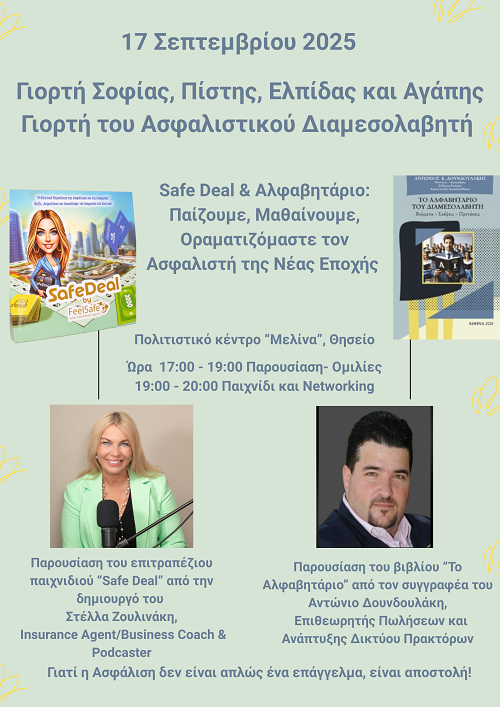 Διοργανωτές της πρωτοβουλίας είναι η Στέλλα Ζουλινάκη, Insurance Agent, Business Coach, Podcaster και δημιουργός του «Safe Deal», καθώς και ο Αντώνης Δουνδουλάκης, Επιθεωρητής Πωλήσεων & Ανάπτυξης Δικτύων Πρακτόρων, Θεολόγος – Αγιογράφος και Συγγραφέας του «Το Αλφαβητάριο του Διαμεσολαβητή». Οι δύο τους ενώνουν δυνάμεις για να αναδείξουν τον καθοριστικό ρόλο του σύγχρονου διαμεσολαβητή. Την εκδήλωση στηρίζουν η Feel Safe Insurance Agent και η Brokers Union.
