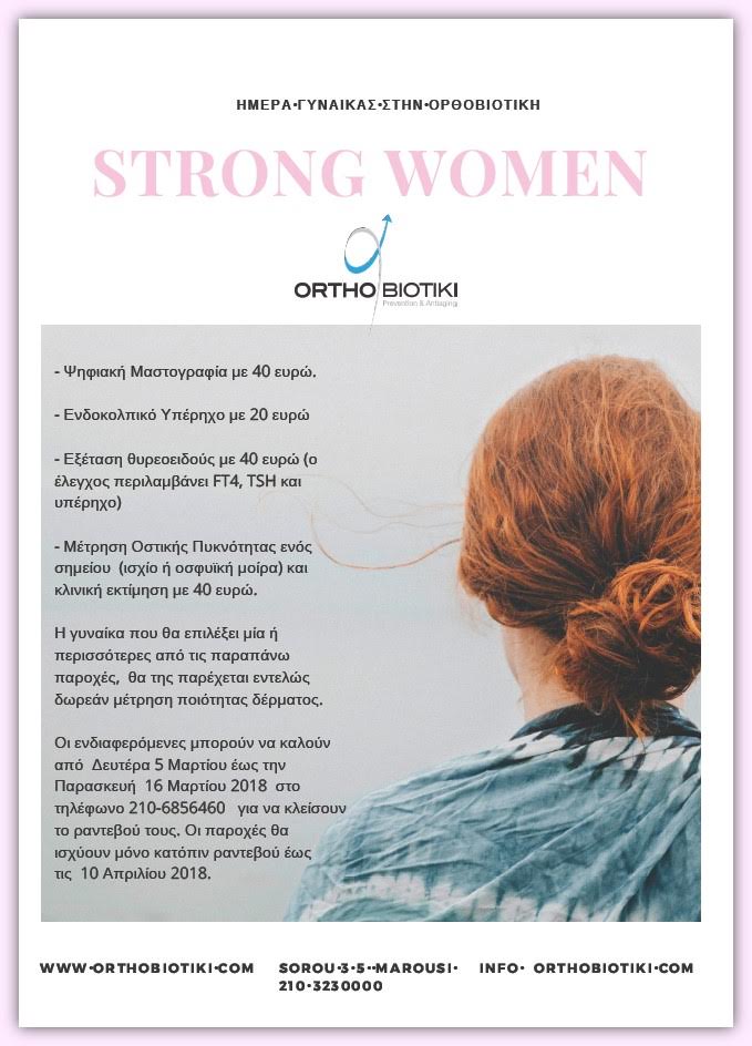 Με την ευκαιρία της Παγκόσμιας Ημέρας της Γυναίκας, από την Τρίτη 8 Μαρτίου 2018, η ΟΡΘΟΒΙΟΤΙΚΗ γιορτάζει και φέτος μαζί με όλες τις γυναίκες και προσφέρει προληπτικούς ελέγχους υγείας και ομορφιάς σε προνομιακές τιμές. Η Globalnet συνεργάζεται με την ΟΡΘΟΒΙΟΤΙΚΗ, ένα από τα μοναδικά πρότυπα πολυϊατρεία Προληπτικής και Αναγγενητικής Ιατρικής στην Ευρώπη, που δημιουργήθηκε με σκοπό να συμβάλει στην απόκτηση της βέλτιστης υγείας, στη μακροβιότητα του ατόμου, αλλά και στην εξασφάλιση υψηλής ποιότητας ζωής