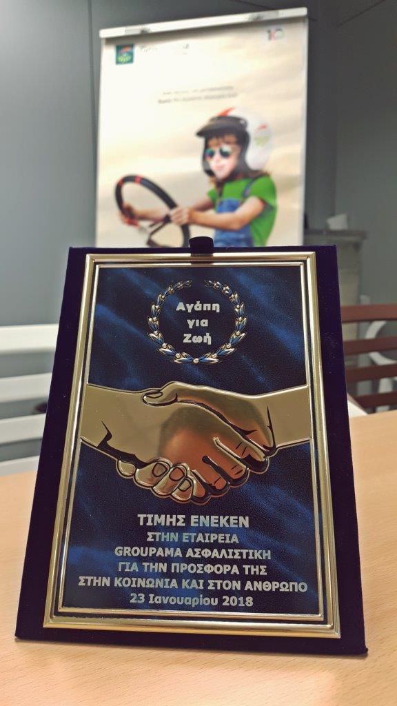 Η Groupama Ασφαλιστική τιμήθηκε φέτος από τον Πανελλήνιο Σύλλογο Πρόληψης Τροχαίων Ατυχημάτων Ανηλίκων «Αγάπη για Ζωή», για την ανιδιοτελή και σημαντική προσφορά της στο έργο του Συλλόγου, κατά τη διάρκεια ειδικής ενημερωτικής συνάντησης που πραγματοποιήθηκε την Τρίτη 23 Ιανουαρίου 2018.