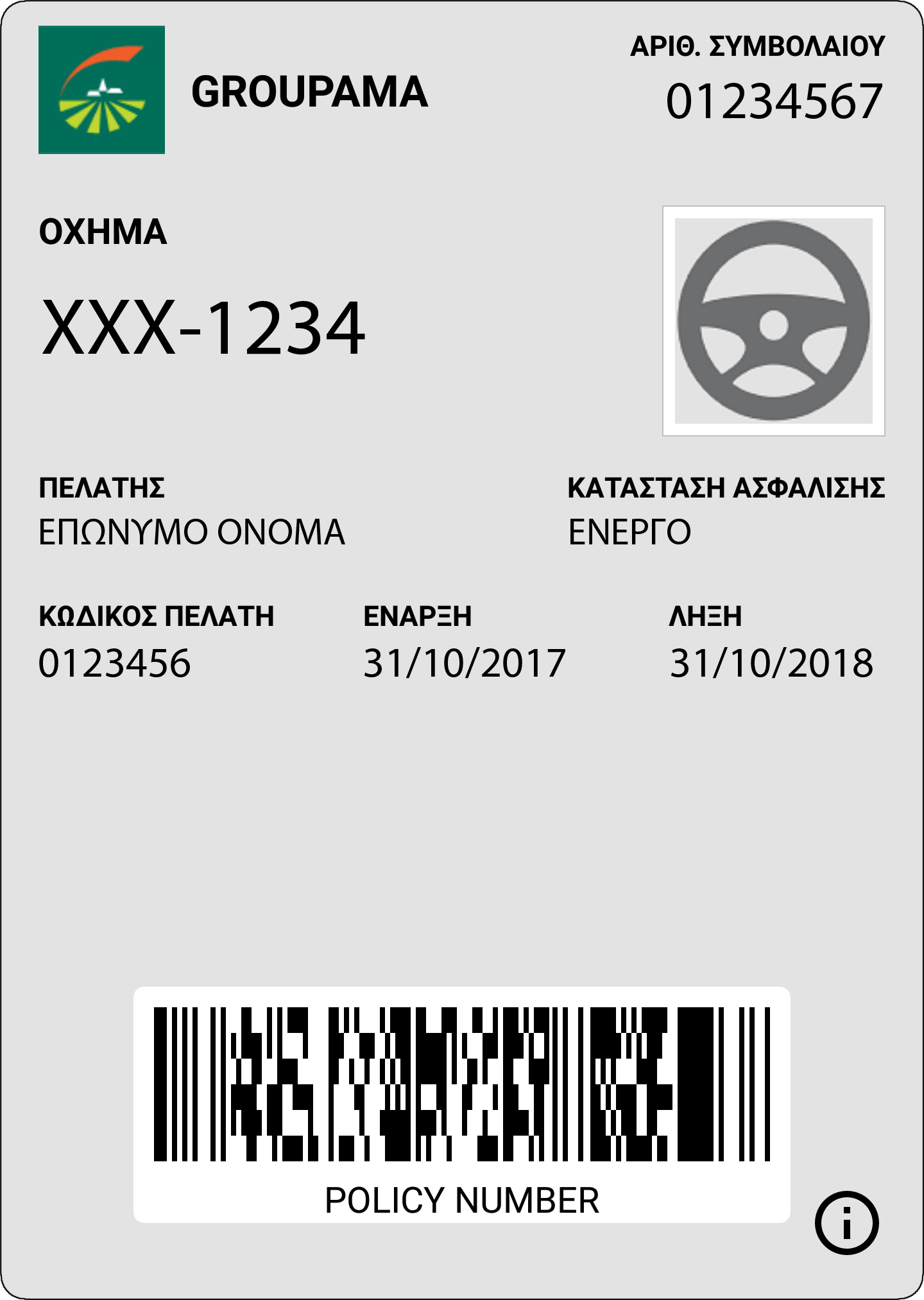Oι πληροφορίες που αναγράφονται στο «Groupama Pass» έχουν ενημερωτικό χαρακτήρα και δεν υποκαθιστούν οποιοδήποτε πιστοποιητικό ασφάλισης. Οδηγίες εγκατάστασης και χρήσης: Οι υποψήφιοι χρήστες μπορούν να έχουν στη διάθεσή τους τη νέα, πρωτοποριακή υπηρεσία της Groupama Ασφαλιστικής, «κατεβάζοντας» το Pass των οχημάτων τους, που παρέχεται μέσω του ηλεκτρονικού Χώρου Πελατών της Groupama Aσφαλιστικής.