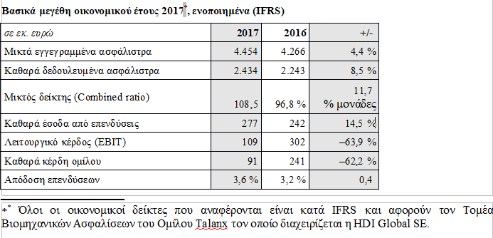 Η HDI Global SE (HDI), η εταιρεία βιομηχανικών ασφαλίσεων του Ομίλου Talanx, σημείωσε σημαντική αύξηση των εσόδων από ασφάλιστρα το οικονομικό έτος 2017. Συγχρόνως, τα οικονομικά αποτελέσματα της εταιρείας δέχθηκαν πιέσεις από την εξαιρετικά υψηλή επιβάρυνση λόγω φυσικών καταστροφών.
