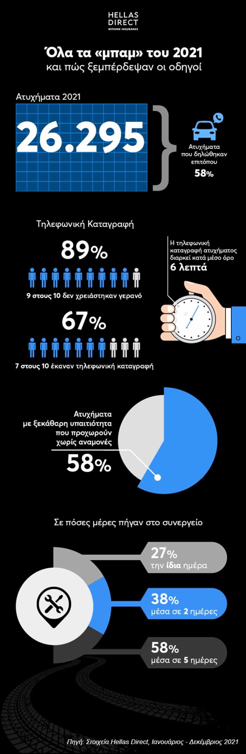 Ξέρουμε πως ένα ατύχημα είναι πιθανό να ταραχτείς, να τρομάξεις, να θέλεις να φύγεις και να ασχοληθείς αργότερα. Να ξέρεις όμως πως θα βοηθήσεις πολύ την κατάσταση αν κάνεις το πρώτο μικρό βήμα και τηλεφωνήσεις στην ασφαλιστική σου την ίδια στιγμή, από το σημείο του ατυχήματος. Την επιλογή αυτή έκαναν το 2021 σχεδόν 6 στους 10 ασφαλισμένους στην Hellas Direct που είχαν ένα ατύχημα στον δρόμο. Γιατί, όσο πιο γρήγορα ειδοποιήσεις τόσο πιο γρήγορα ανοίγει ο φάκελός σου. Και τόσο πιθανότερο είναι εξίσου γρήγορα να κλείσει, να φτιάξεις το όχημά σου και να αποζημιωθείς.