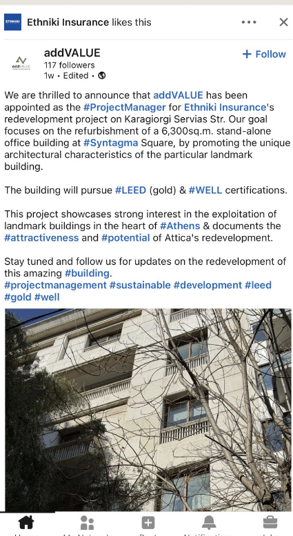 Επικεφαλής στα σχέδια για το ιστορικό κτίριο της Εθνικής Ασφαλιστικής που βρίσκεται στην οδό Καραγιώργης Σερβίας έχει τεθεί η addVALUE. Όπως αναφέρει η εταιρεία στόχος της είναι η ανακαίνιση 6.300 τμ του κτιρίου στην πλατεία Συντάγματος αναδεικνύοντας τη μοναδική αρχιτεκτονική που το χαρακτηρίζει.