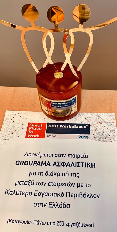 Η Groupama Ασφαλιστική διακρίθηκε ως μία από τις δέκα «μεγάλες επιχειρήσεις» (προσωπικό άνω των 251 εργαζομένων) με το καλύτερο εργασιακό περιβάλλον στην Ελλάδα (“Best Workplaces 2019”).